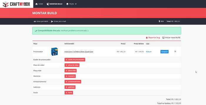Nele você poderá comprar cada peça de acordo com sua disponibilidade de renda. O site é completamente automatizado e lhe dá os melhores valores de cada peça ao pesquisar automaticamente em todas as lojas brasileiras. Duas coisas bacanas é que ele também lhe dá o preço caso deseje pagar a vista no boleto (comumente mais barato) e que ele avisa se algum item escolhido seria incompatível. Isso, particularmente, é incrível, pois é o meu grande medo ao montar um PC. O que acontecerá se eu investir um dinheiro numa nova peça e ela não funcionar?