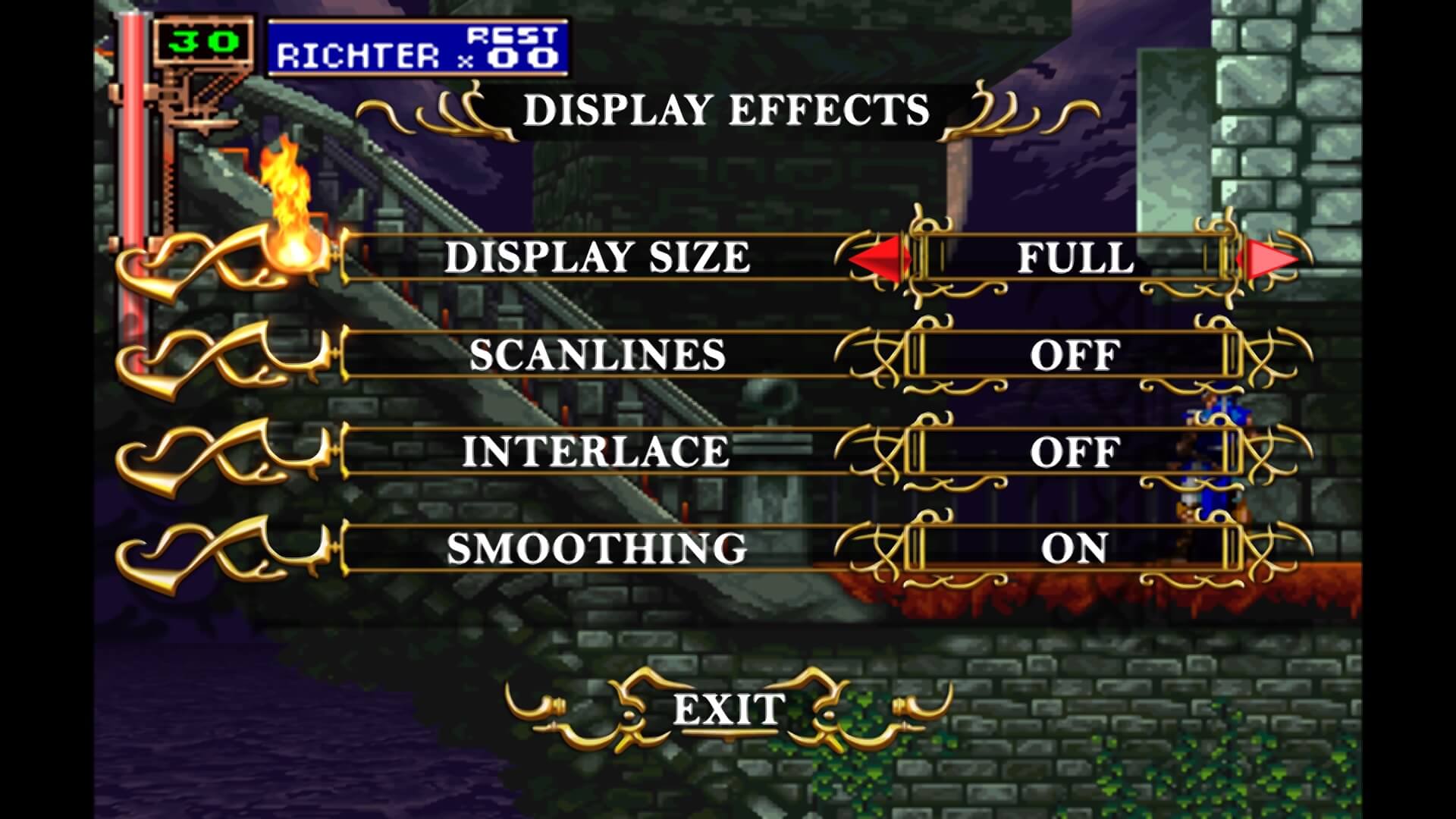 Vamos começar pelo primeiro problema. O jogo foi programado para telas pequenas da época em que os jogos foram lançados. Portanto, o nível de interpolação e sombreamento cabiam no jogo. Alucard, por exemplo, apesar de não ter um rosto definido e nem cabelos esvoaçantes e perfeitos, nosso cérebro era condicionado a interpretar uma expressão facial, devido ao tamanho e a até certo ponto, a ausência explícita dos pixels. O fato é que agora o Alucard está gigante, e parece um boneco de Atari 2600. É possível amenizar bem essa situação no menu de opções que aparece antes de escolher o título que irá jogar, acionando o “smoothing”. Outra opção legal é o próprio tamanho da tela. Se você se incomodar com o Alucard boneco de Olinda, diminua a tela e ponha do seu jeito. Ok, se acalmem, isso era óbvio, mas o cuidado que mencionei acima é justamente isso. Não caberia um simples trabalho de sombreamento, uma espécie de maquiagem?