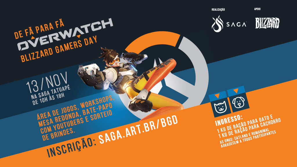 Neste domingo (13/11), das 10h às 18h, a SAGA, maior rede de escolas de desenvolvimento de games, arte digital, design e efeitos visuais, abre as portas da unidade do Tatuapé para a primeira edição do Blizzard Gamers Day, evento dedicado aos fãs de Overwatch, game de tiro em primeira pessoa da Blizzard. O Blizzard Gamers Day é aberto ao público, os interessados devem se inscrever pelo site da SAGA e, no dia, levar 1kg de ração para gatos e 1kg de ração para cachorros, que serão doadas às ONGs Catland e Humanimal.