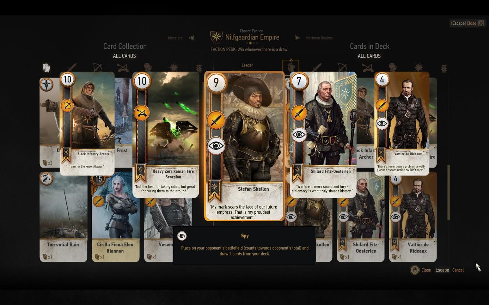 Parte de uma atualização que traz diversas novidades para o game, a facção de Nilfgaard introduz um estilo de jogo focado no domínio sobre o campo de batalha. Ela fornece ao jogador um leque de novas mecânicas baseado no controle das cartas na mão de seu oponente, seja para revelar as cartas que ele possui, obter o controle sobre a ordem das cartas em seu baralho e o uso de unidades desleais que se infiltram no campo de batalha do adversário para fornecer melhorias e vantagens para o jogador que a usou.