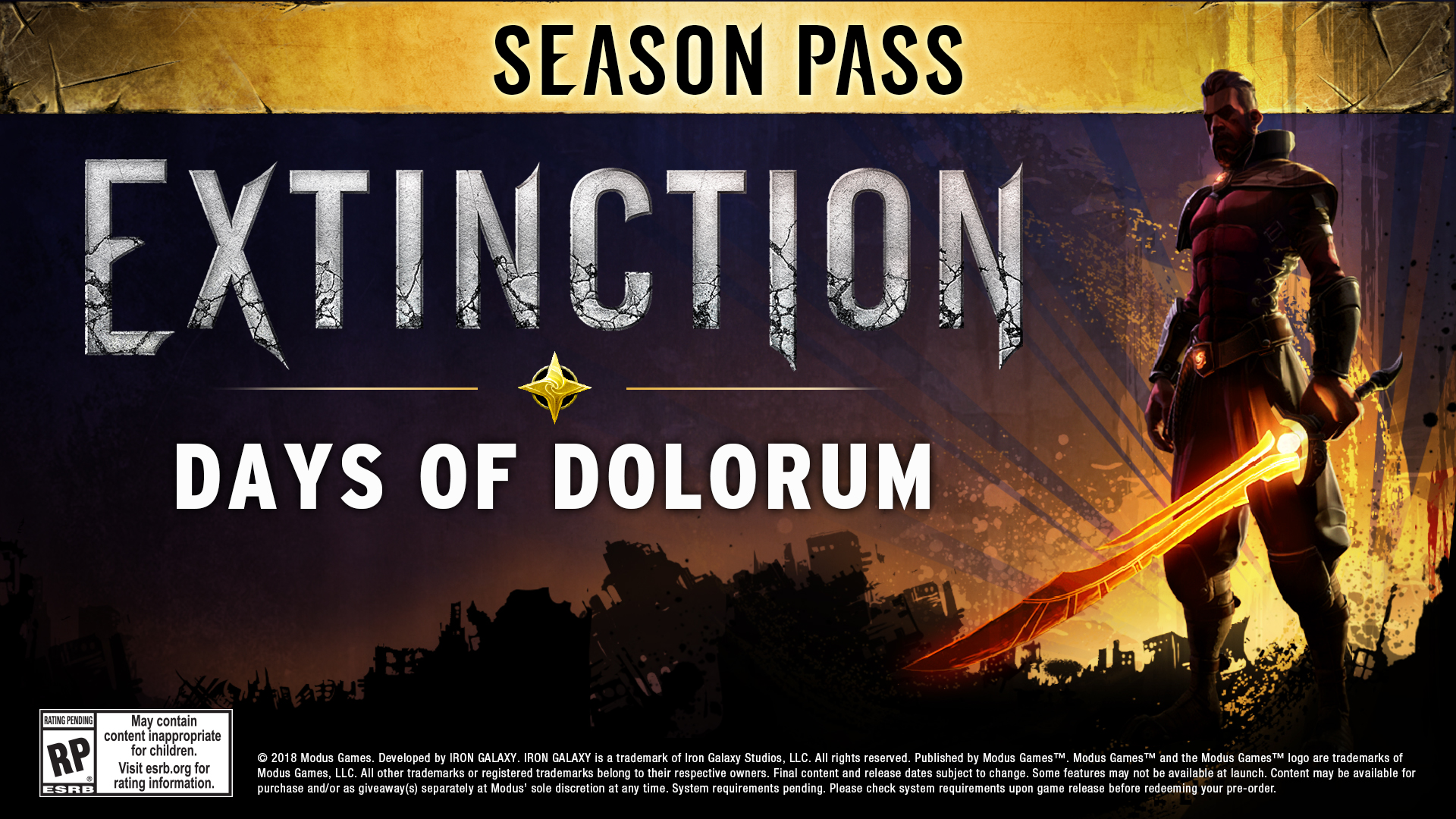 Após um chamativo anúncio na E3 em 2017, Extinction ficou fora do radar por vários meses. Hoje, as produtoras do game Iron Galaxy e Modus Games anunciaram a data de lançamento do jogo: dia 10 de abril para PS4, Xbox One e PC. O jogo já está disponível para pré-compra, nas edições padrão e Deluxe, que inclui o Passe de Temporada do jogo.