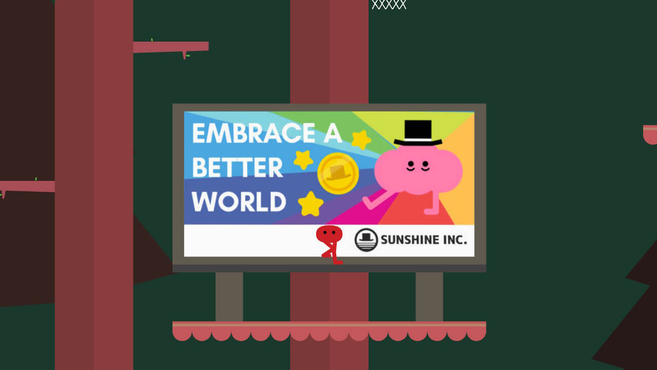 O gameplay de Pikuniku é MUITO simples. Ele é um jogo de plataforma da esquerda para direita onde é possível pular, chutar as pessoas/coisas e utilizar uns chapéus (existem vários para colecionar) que pode te dar um poder/ação. Inicialmente eu pensei que seria muito fácil e bobo e até foi, porém só seu início.