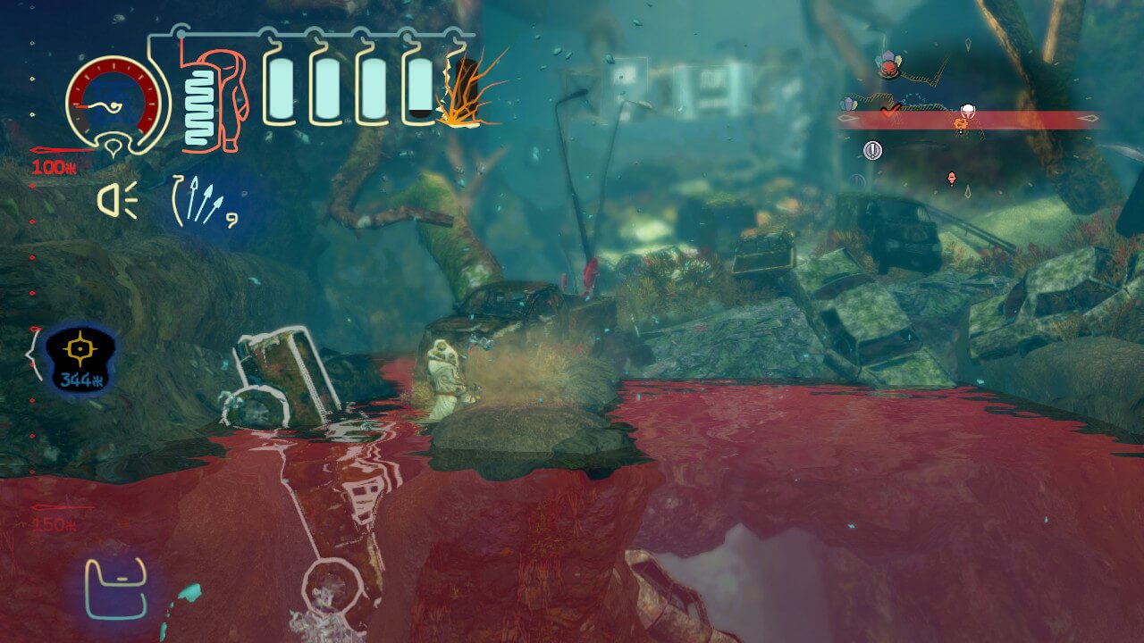 O interessante é que o oxigênio acaba sendo o sistema de vida do jogo. Ao ter uma forte queda ou então ao ser atacado por um dos peixes do oceano, você terá seus tanques extras danificados até se quebrarem por vez. No geral é uma mecânica legal e não apresenta grande dificuldade, pois existe uma boa quantidade de tanques adicionais jogados pelo cenário.