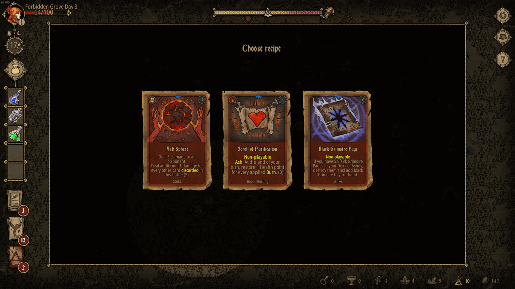 Cada círculo no mapa representa um passo que pode fornecer eventos e diferentes recursos, estes que dão o toque RPG a Deck of Ashes. Há muitos recursos que podem ser utilizados para melhorar atributos, cartas e abrir baús. São eles: