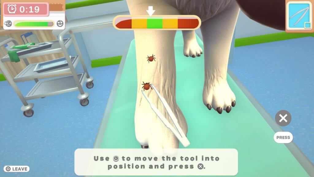 Após isso, começa uma sequência de mini-games. Partindo de coisas mais simples, como achar um machucado ou remover carrapato apenas segurando um botão, até algo mais trabalhoso, como usar a memoria para acertar uma sequencia ou apertar botões no momento certo.