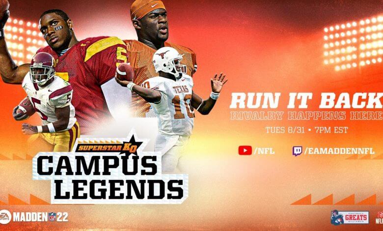 Para destacar o lançamento de “Campus Legends”, os ex-atletas de capas da EA SPORTS – a lenda da Universidade do Texas Vince Young e a lenda da USC Reggie Bush – se enfrentarão no Rose Bowl Stadium representando suas respectivas escolas em um confronto de Madden NFL 22. A dupla voltará ao infame confronto do Rose Bowl de 2006, com o ex-aluno da USC Matt Leinart e a locutora da ESPN Beth Mowins como equipe de comentaristas. O showdown será transmitido hoje, às 20h00 (horário de Brasília), no canal da NFL no YouTube e na Twitch do Madden NFL.