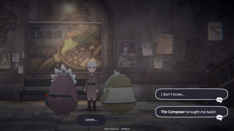 DEEMO II coloca um foco maior na história do que seu antecessor, com mais de 50 personagens únicos para interagir. Os jogadores podem resolver problemas para esses novos personagens enquanto conhecem suas histórias de fundo e avançam na história principal. Mesmo que cada personagem esteja tentando sobreviver a uma situação potencialmente apocalíptica, Rayark promete preencher o jogo com beleza, esperança e humanidade, não desolação.