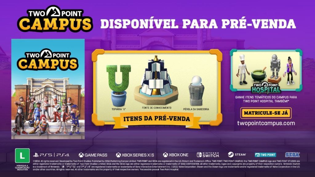 Os jogadores podem acessar site oficial para encomendar uma cópia física do jogo, ou aderir à pré-venda de Two Point Campus no Steam, Sony PlayStation 4|5, Microsoft Xbox One e Xbox Series X|S, digitalmente, através das lojas das próprias marcas – com a versão do Nintendo Switch via eShop ficando disponível em breve. Two Point Campus também estará disponível no Xbox Game Pass para console e PC Game Pass no Day One. Prepare-se para se divertir no Campus agora mesmo.