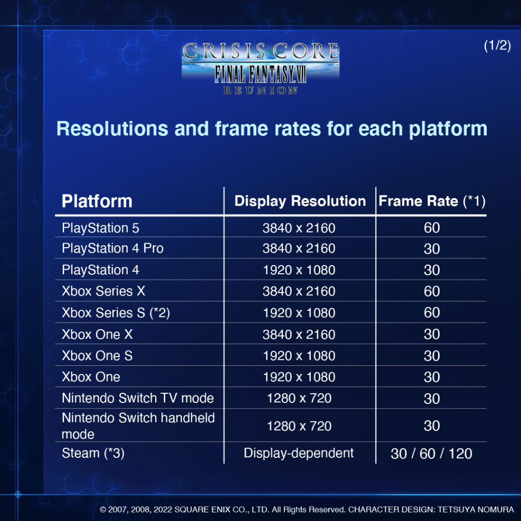 A Square Enix também revelou um infográfico que detalha a resolução e a taxa de quadros que cada versão do CRISIS CORE –FINAL FANTASY VII– REUNION oferece: resolução nítida de 4K no PS5 e no Xbox Series X (cerca de 63 vezes mais pixels do que no PSP) máximo de 120 quadros por segundo no PC para uma experiência ainda mais fluida. Os requisitos de sistema do PC para o jogo podem ser encontrados na página oficial do STEAM.