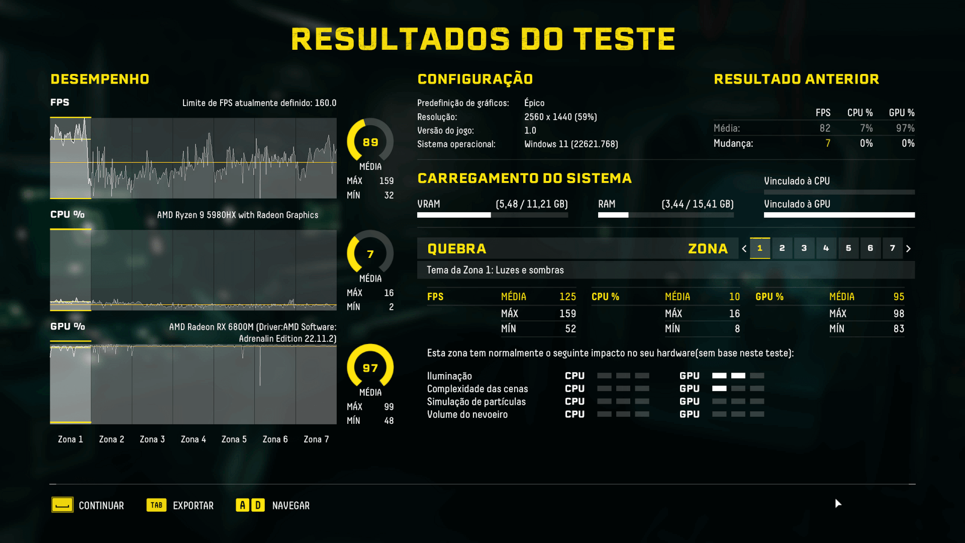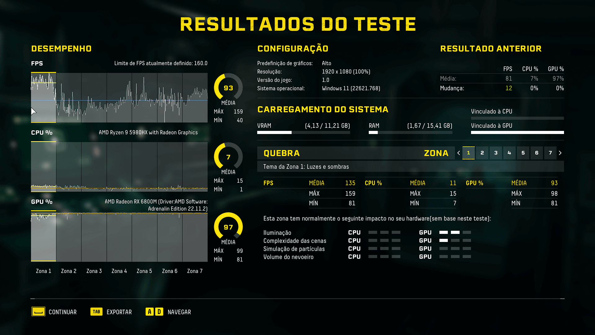 Mas ainda tem mais! Returnal traz uma opção interna de benchmark onde dirá não apenas a média de frames nesse teste, algo usual nesse tipo de opção, mas também dirá o que está sendo testado em cada parte e que parte do equipamento está sendo mais utilizado entre CPU e GPU para cada bloco de teste.