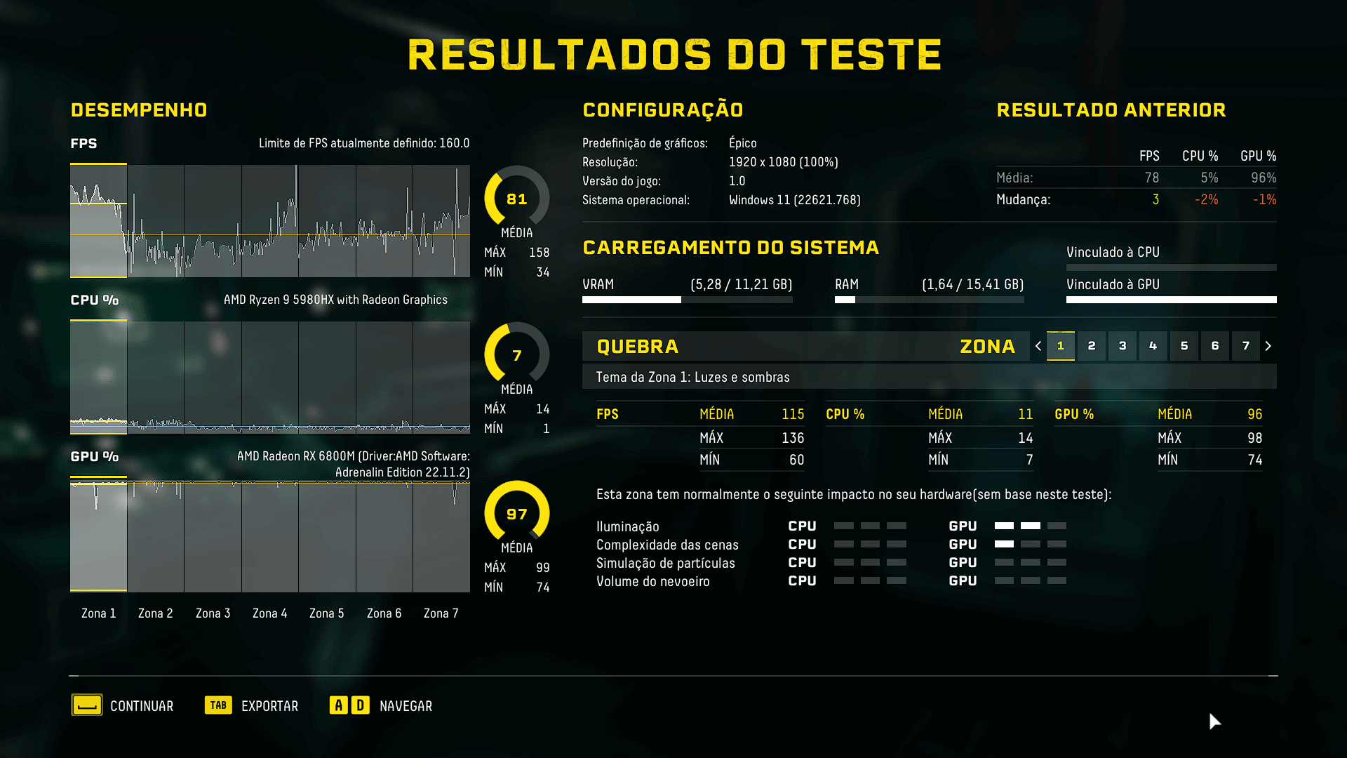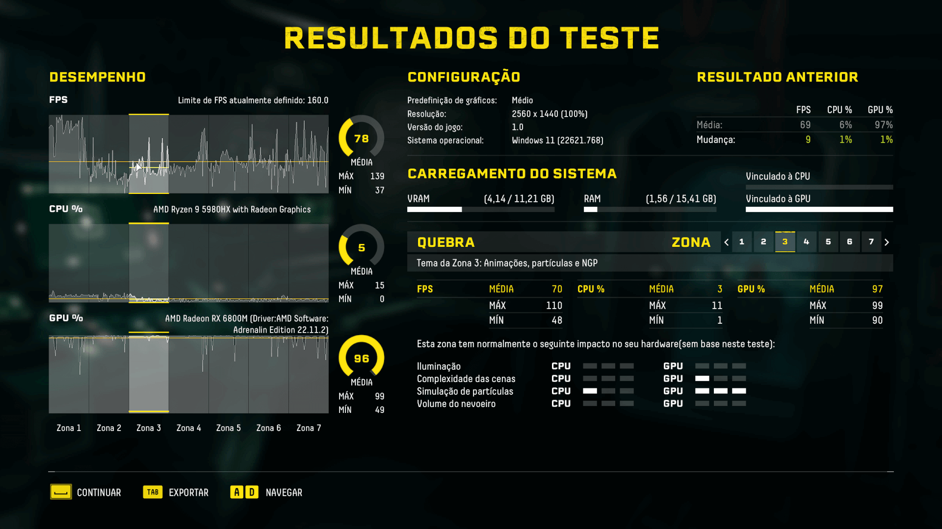O mesmo serve para a CPU que mostrava uma utilização média de 10% enquanto em nossas ferramentas flutuava entre 25% até 40%. Isso não é algo que influencie em nada o jogo, porém, essa ferramenta interna precisa de alguns ajustes. No resto, os resultados batem com os que fizemos.