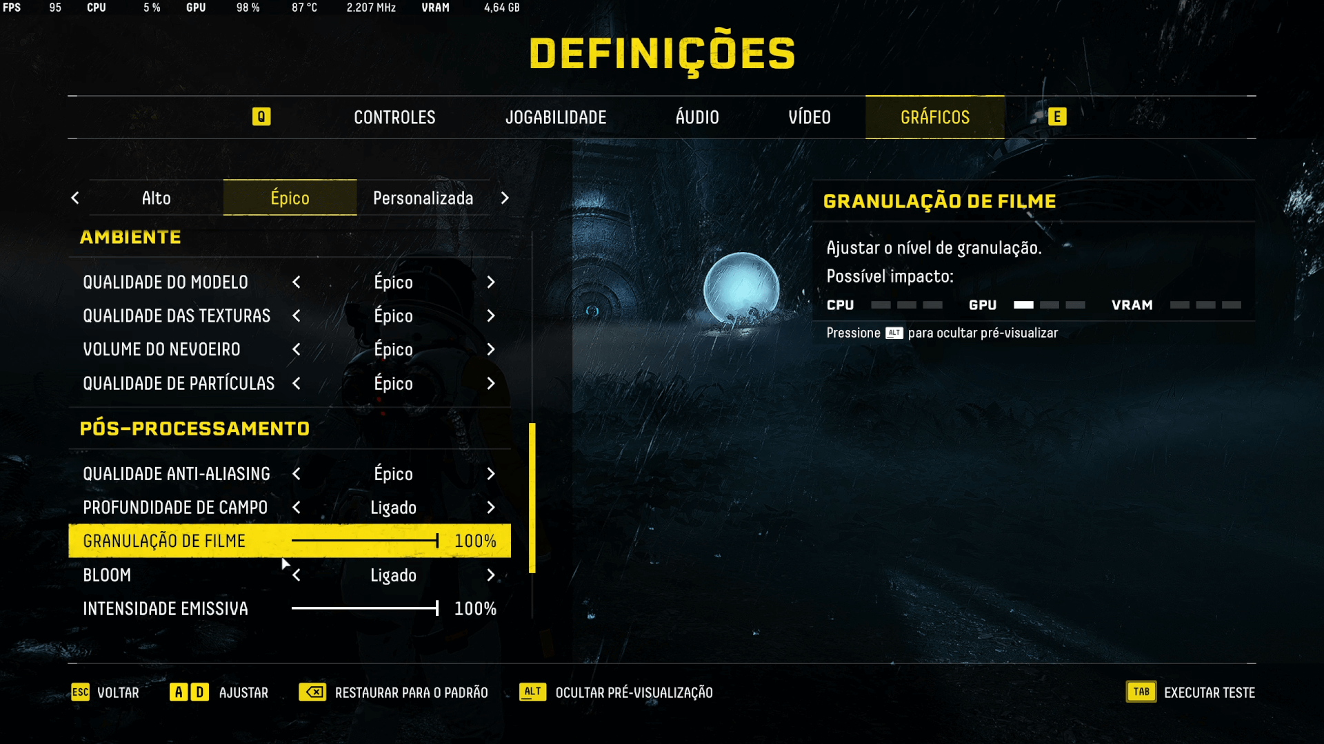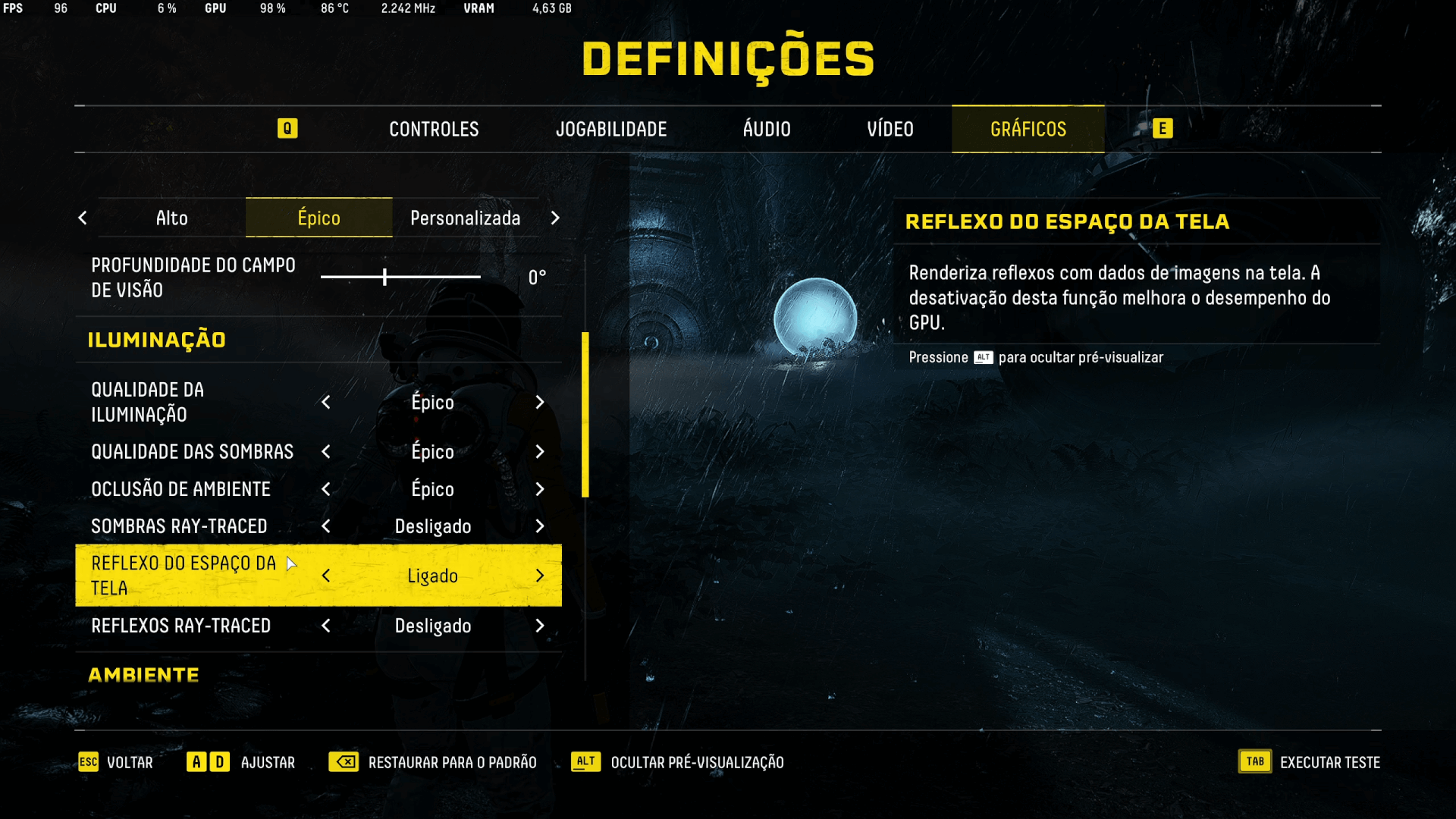 E acredito que esteja se perguntando sobre o Ray Tracing certo? Bem, a GPU AMD não é feita para o Ray tracing e quando tentei ativar eu tive uma perda de 30 frames ou mais dependendo do nível do Ray tracing. Inclusive quando coloquei o Ray Tracing em Alto ou Épico, simplesmente eu recebia uma mensagem do jogo dizendo que a minha GPU não era própria para essa tecnologia.