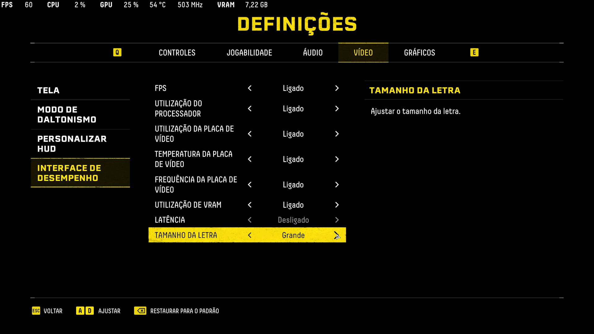 E além dessa parte que já deixa impressões positivas temos as opções visuais de desempenho. E o que é isso? Bem, muitos já devem ter visto tanto em nossas análises como de outros canais uns números sobrepostos ao jogos mostrando os frames, utilização de RAM, frequência, temperatura e mais. Bem, Returnal traz uma opção nativa desse set de opções te dando mais controle e informações sobre cada peça de seu equipamento.