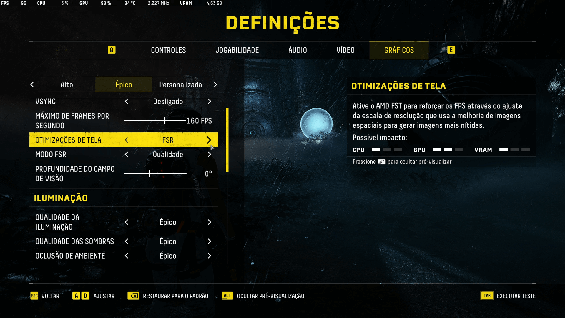 Agora utilizando a tecnologia de upscale FSR eu atingi uma melhora significativa. Sempre testando em épico e rodando na resolução 2K, eu consegui uma média de 82 frames colocando o FSR em qualidade, 89 frames colocando o FSR em equilibrado e, por fim, atingindo uma média de 99 frames colocando o FSR em desempenho.
