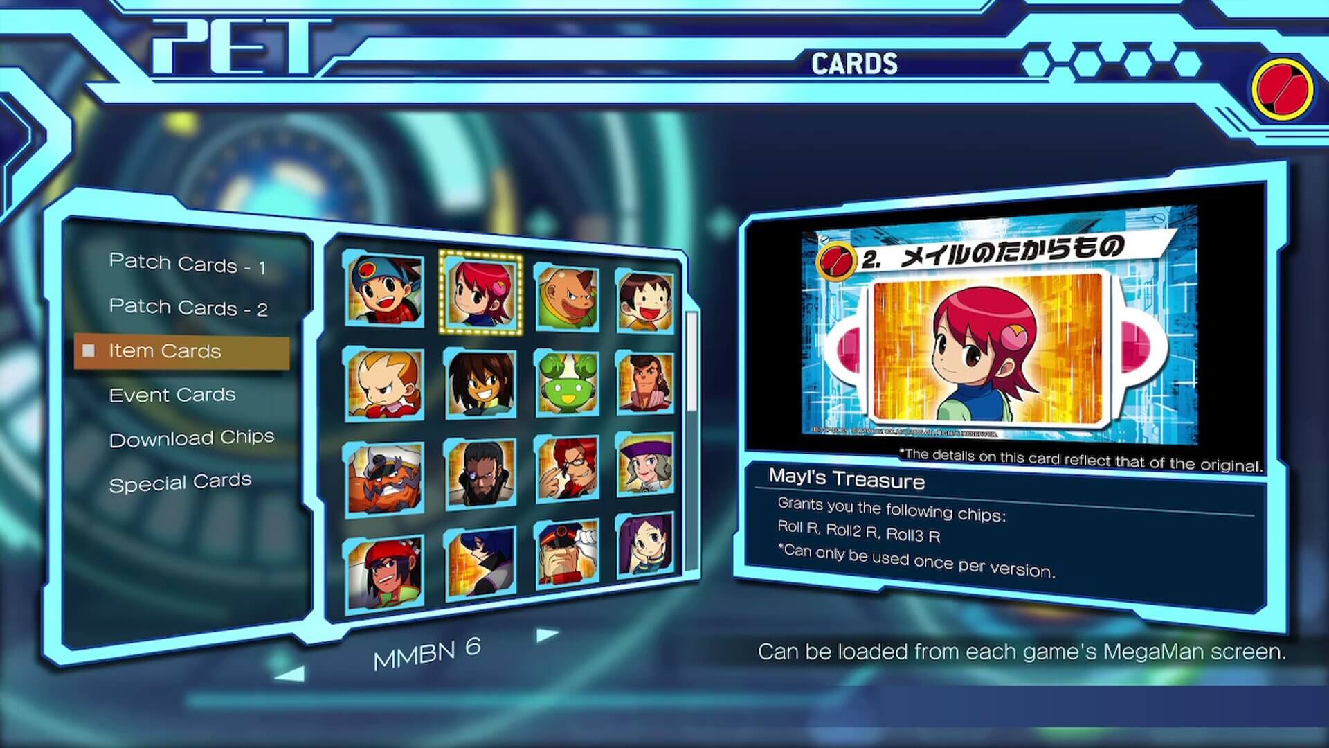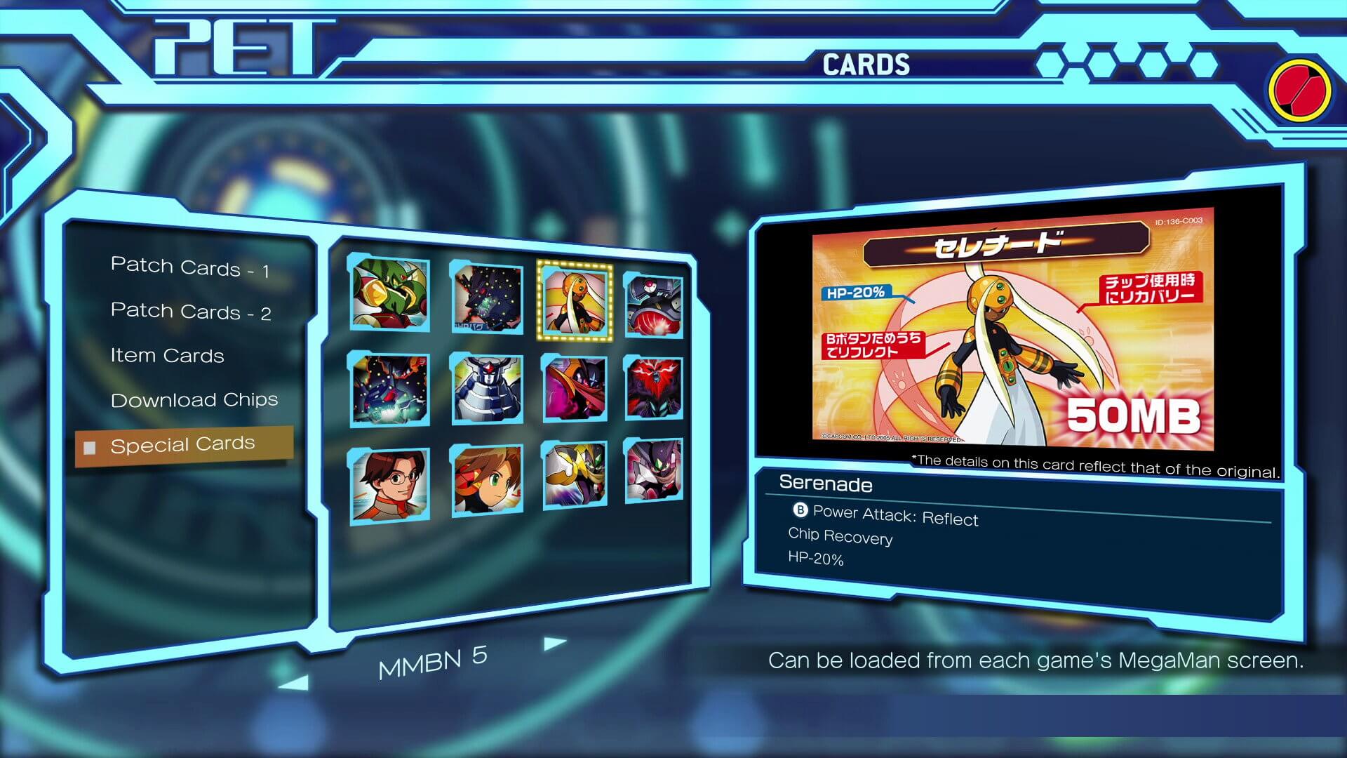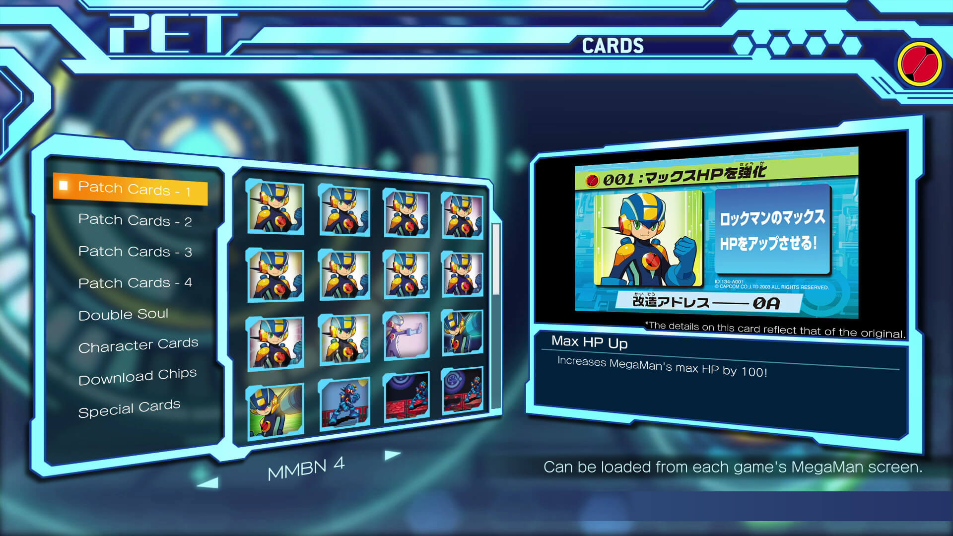 - Inclui todos os 499 Patch Cards – Todos os 499 Patch Cards criados para Mega Man Battle Network 4 em diante serão incluídos na coleção. Anteriormente, esses eram cartões físicos vendidos apenas no Japão e precisavam ser digitalizados no jogo.