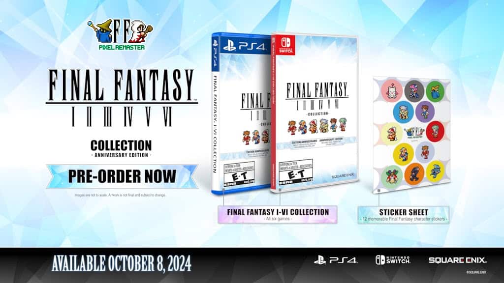 A coleção Final Fantasy Pixel Remaster receberá uma versão física denominada “Anniversary Edition” para PlayStation 4, que também será compatível com PlayStation 5. Esta edição inclui os jogos Final Fantasy I a Final Fantasy VI e vem acompanhada de uma folha de adesivos exclusiva com personagens pixelados.