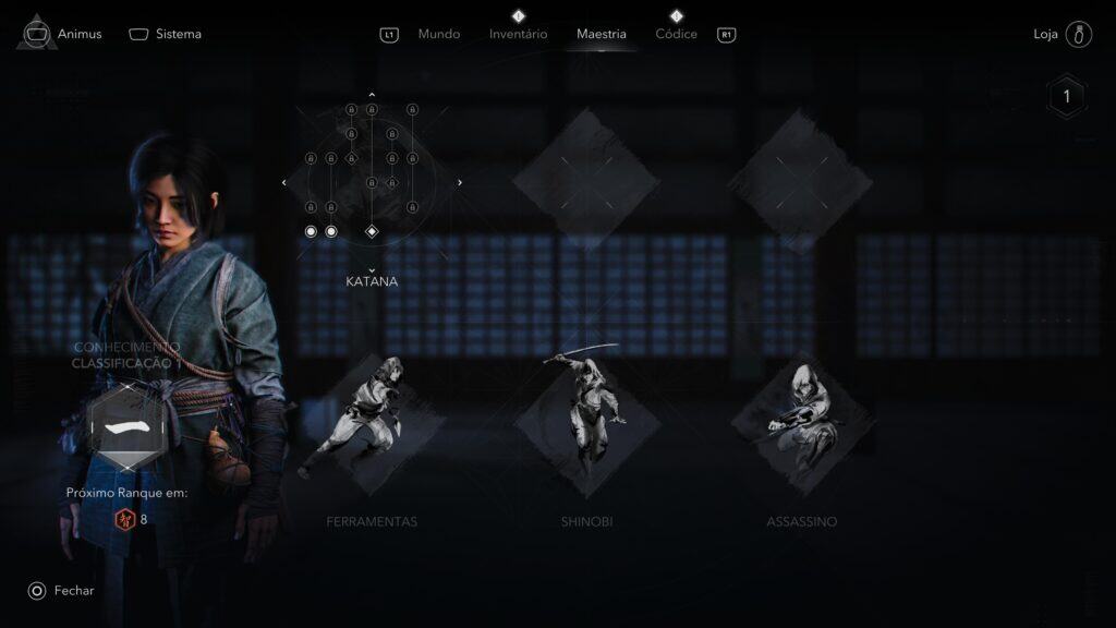 A progressão em Assassin’s Creed Shadows se estrutura através de um sistema integrado de desenvolvimento para ambos os protagonistas. Naoe e Yasuke compartilham o progresso de níveis e dispõem de seis árvores de habilidades cada, permitindo uma evolução simultânea e equilibrada. O sistema de progressão contempla diferentes estilos de jogo, com árvores específicas para cada tipo de arma, além de especializações únicas para Naoe nas vertentes shinobi, furtividade e uso de ferramentas.