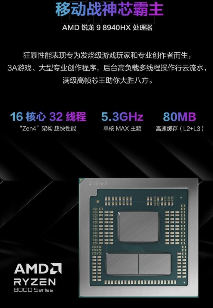 O AMD Ryzen 9 8940HX sucede o Ryzen 9 7940HX da série Dragon Range, mantendo a arquitetura Zen 4. O novo modelo oferece um clock de impulso 100MHz maior em comparação ao seu antecessor. A configuração do 8940HX inclui 16 núcleos e 32 threads, com um clock de impulso de até 5.3 GHz. A memória cache total L2+L3 é de 80 MB, com 64 MB de L3 cache sendo mantidos do modelo anterior.