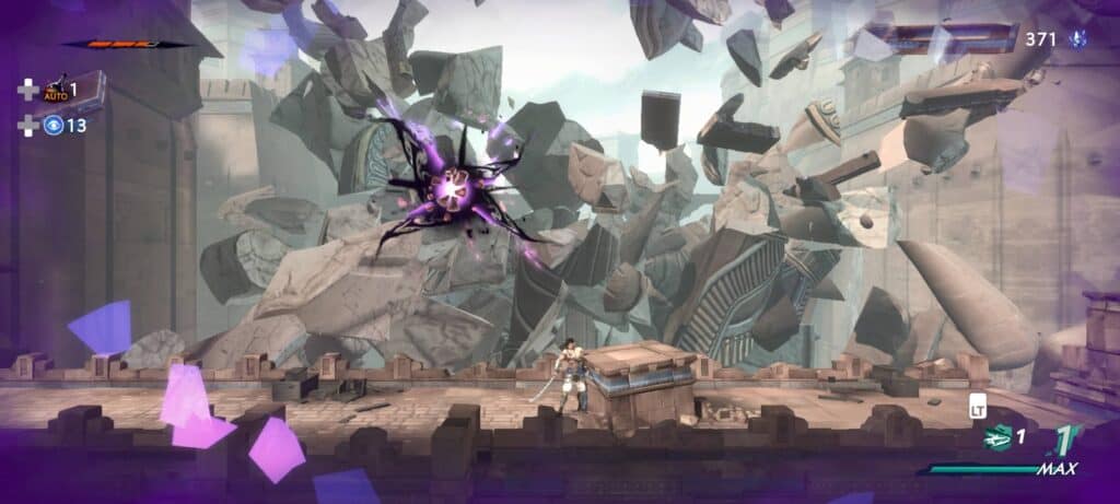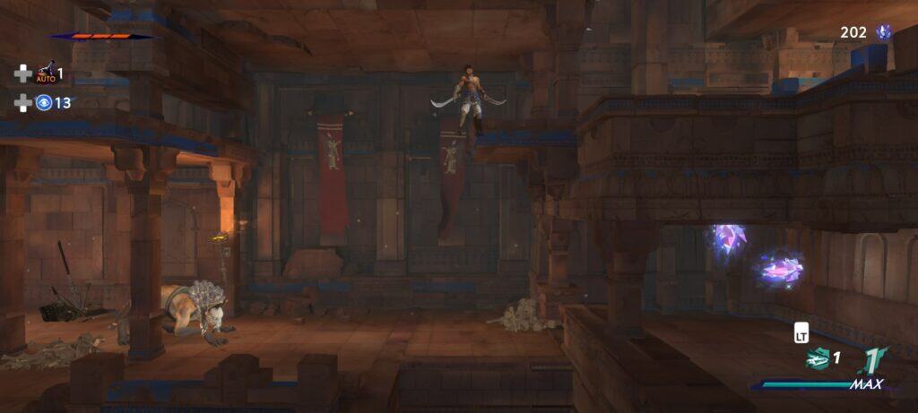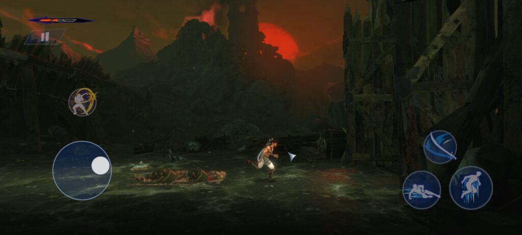 O maior ponto de atenção, no entanto, surge quando se joga diretamente com os controles na tela (touchscreen). Embora os comandos funcionem corretamente, o design de Prince of Persia The Lost Crown — focado em ação e plataformas com inimigos surgindo de ambos os lados e pulos precisos — exige bastante visibilidade. Como as mãos ocupam as extremidades da tela, parte da percepção visual do jogador é comprometida, dificultando a identificação de inimigos e obstáculos. Essa limitação é particularmente sentida em telas menores, como as de smartphones. Em tablets, esse problema tende a ser reduzido, já que há mais espaço para exibir os elementos do jogo sem obstruções significativas.