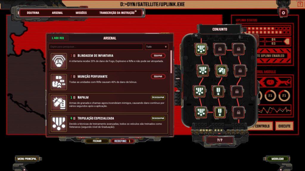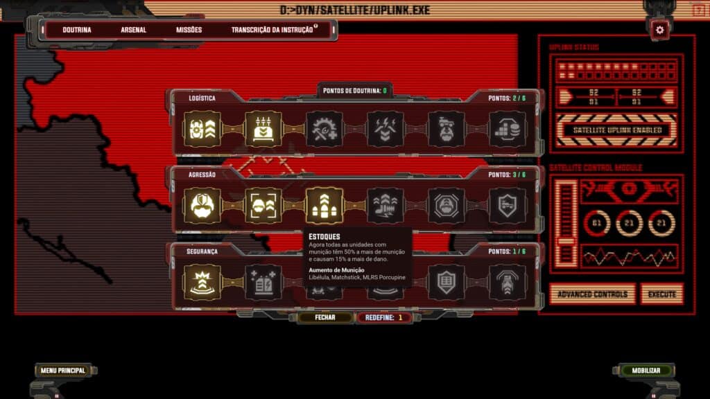Ao fim de cada missão, o jogador recebe pontos de experiência, utilizados em uma árvore de habilidades que permite desbloquear bônus passivos, como aumento de vida das unidades ou armamentos alternativos (mísseis por lasers, por exemplo). Também é possível desbloquear equipamentos especiais que oferecem vantagens pontuais, com builds personalizáveis que se adaptam a diferentes estilos de jogo.
