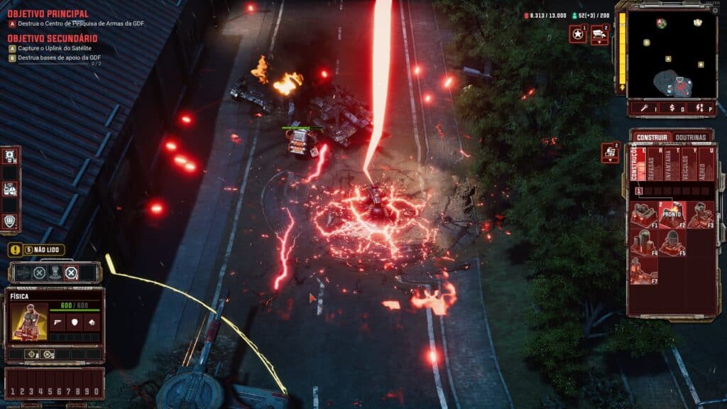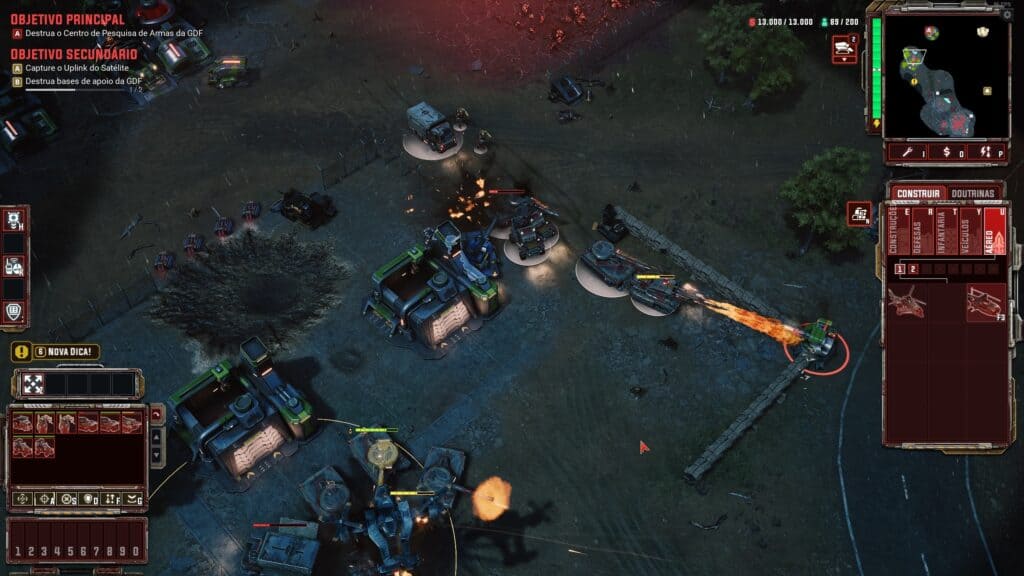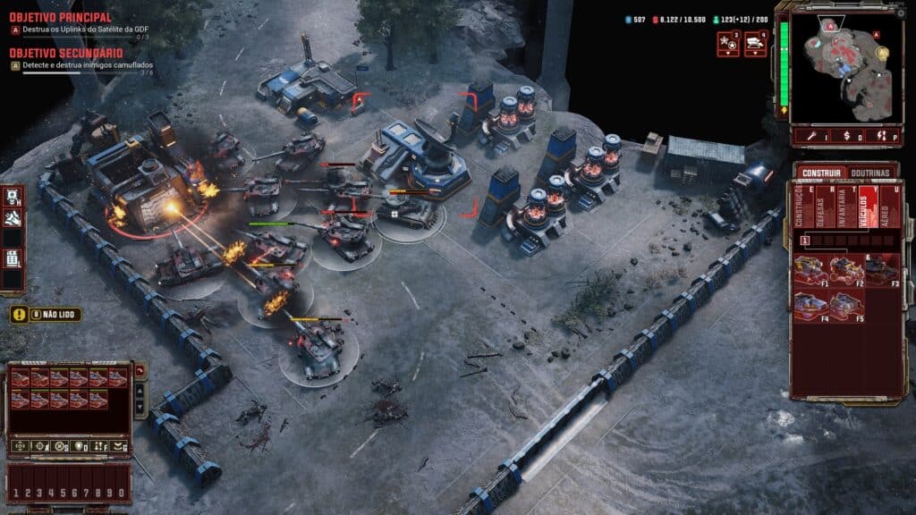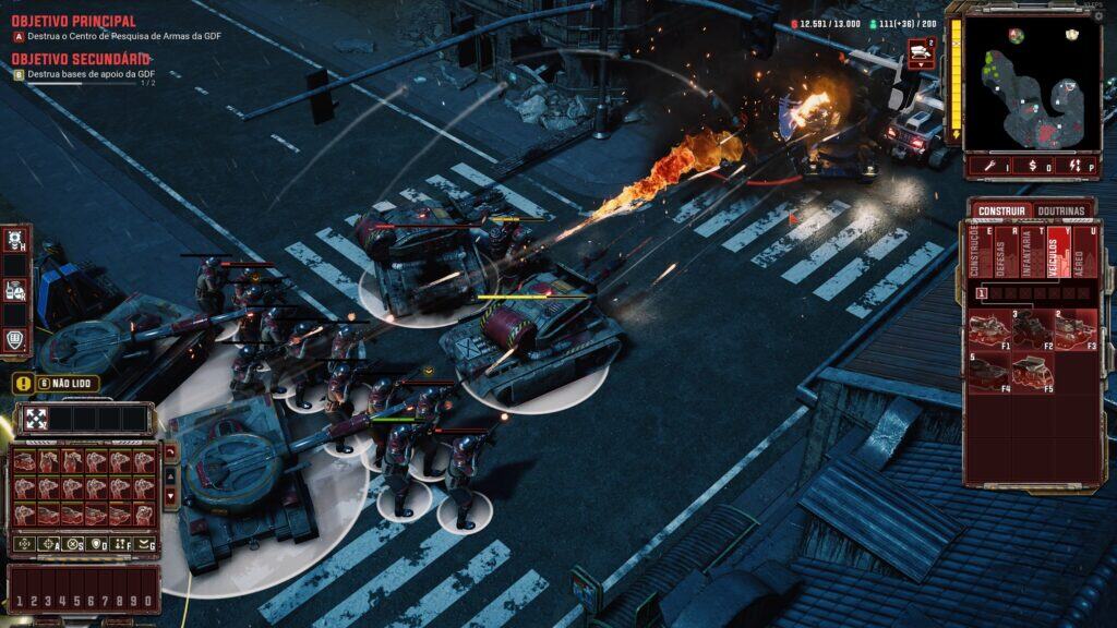 Complementando a experiência, cada facção possui comandos especiais — habilidades que podem ser ativadas ao longo da campanha, como ataques de precisão, interferências tecnológicas ou reforços táticos. A GDF, por exemplo, pode ativar zonas de construção avançada longe de sua base, criando possibilidades únicas de expansão e cerco.