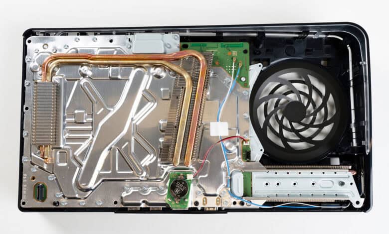 Uma das inovações mantidas no PS5 Pro é o uso de metal líquido como material de interface térmica para o processador principal, garantindo um resfriamento eficiente. A unidade de fonte de alimentação também foi ampliada para suportar o aumento de potência necessário.