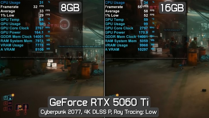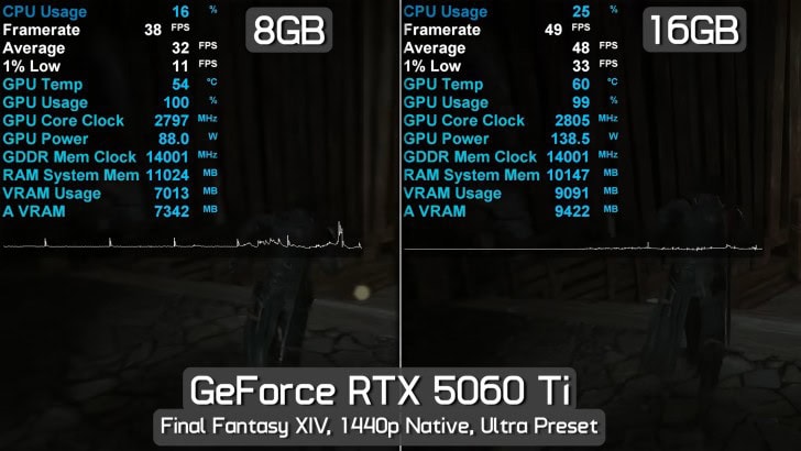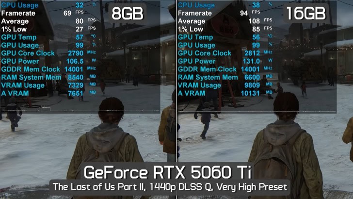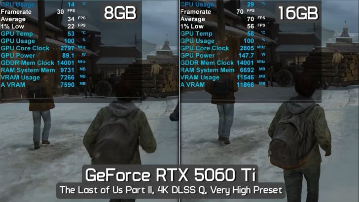 O modelo de 8GB foi testado em títulos AAA, como The Last of Us Part II, Final Fantasy XIV e Hogwarts Legacy, revelando um desempenho inferior em comparação com a versão de 16GB. Em The Last of Us Part II, por exemplo, a variante de 16GB apresentou um desempenho 120% superior no 1% Low FPS em relação ao modelo de 8GB, com uma média de 35 FPS contra 70 FPS, respectivamente, em configurações de qualidade muito alta em 4K. Outros jogos também mostraram diferenças de desempenho entre 30% e 40%.