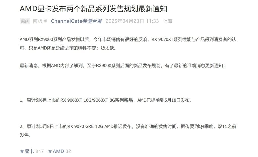 Por outro lado, a placa gráfica Radeon RX 9070 GRE, que estava programada para ser lançada em 8 de maio de 2025, agora foi adiada para o quarto trimestre de 2025, coincidindo com a temporada de vendas do 11.11 na China. Esta placa contará com 12 GB de memória e um barramento de 192 bits, sendo uma variante do GPU Navi 48.
