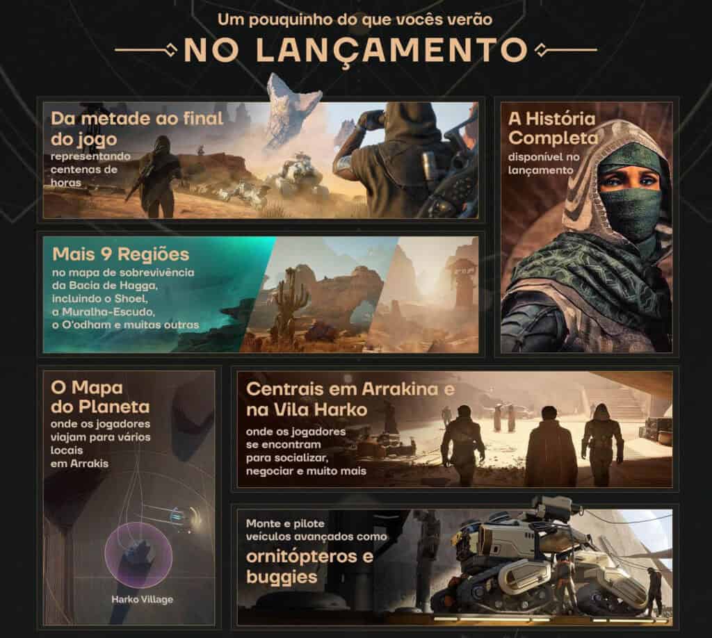 Dune: Awakening está programado para ser lançado em 10 de junho, com uma edição Deluxe e Ultimate que oferece acesso antecipado em 5 de junho e itens exclusivos. A Funcom incentiva os jogadores a seguir as redes sociais oficiais do jogo para atualizações e novidades.