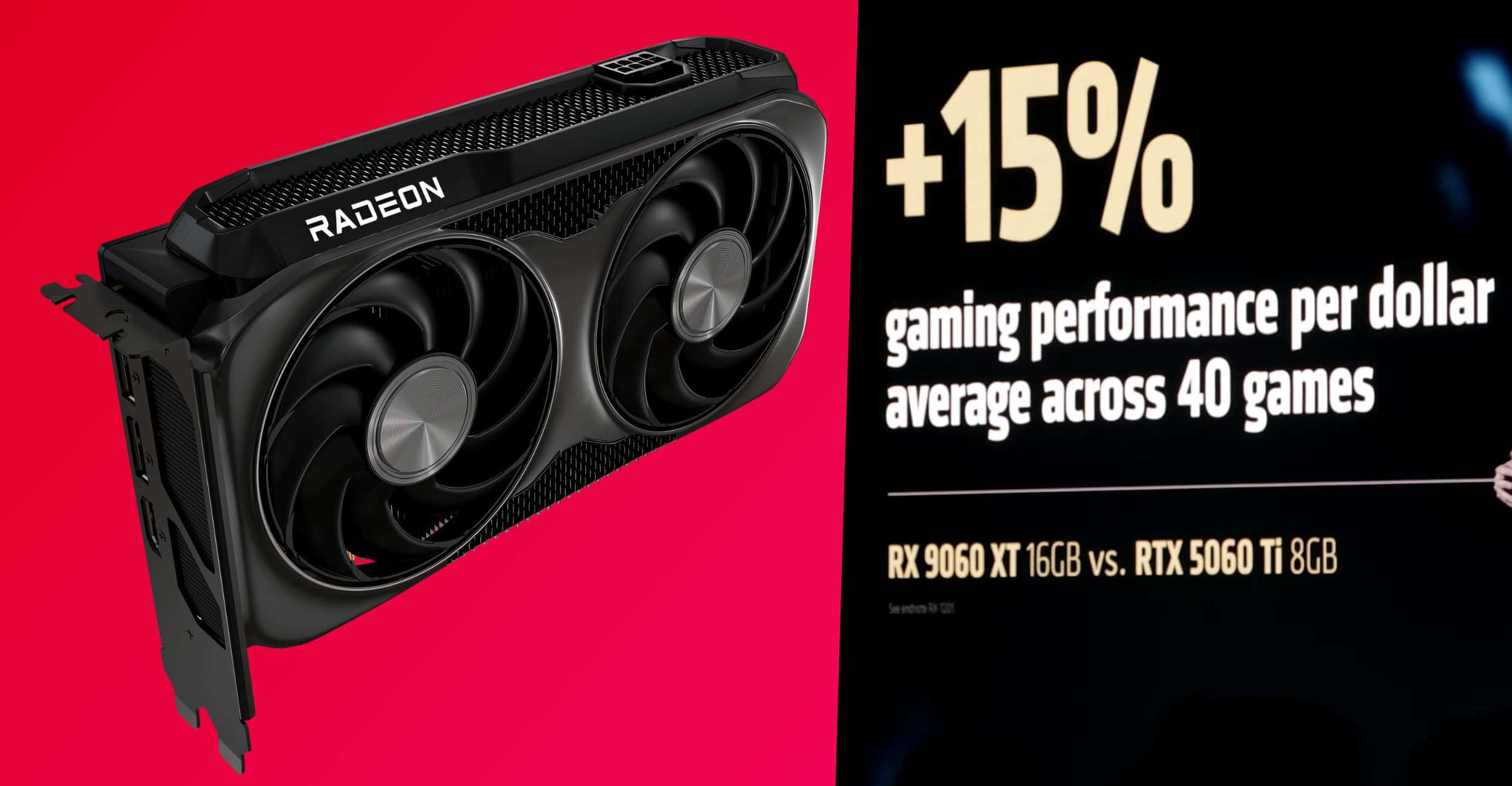 A solução de memória da RX 9060 XT inclui uma interface de barramento de 128 bits e memória GDDR6 de 20 Gbps. Comparada à NVIDIA GeForce RTX 5060 Ti de 16 GB, a nova placa da AMD oferece desempenho 6% superior e 15% mais desempenho por dólar gasto. Os preços sugeridos são de $349 para a versão de 16 GB e $299 para a de 8 GB.