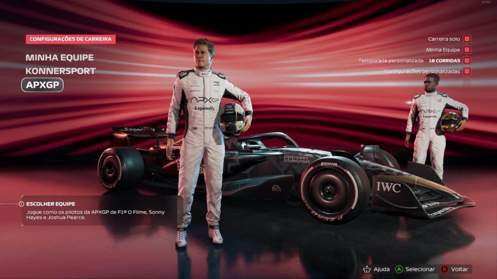 Logo ao iniciar o modo, o jogador pode optar por controlar uma das equipes oficiais da Fórmula 1 ou criar sua própria escuderia, inserindo-a como a 11ª no grid. Essa possibilidade de fundar uma equipe própria não é novidade, mas ganha novos contornos com a introdução de equipes pré-configuradas como a Konnersport Racing (originária do modo história Ponto de Frenagem) e a APXGP, equipe do novo filme da Fórmula 1 estrelado por Brad Pitt. Ambas contam com pilotos modelados e estrutura própria, sendo possível até correr com o ator.