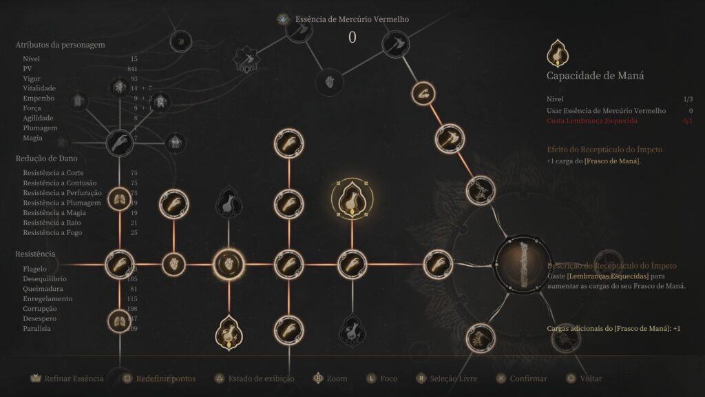 A moeda do jogo, análoga às “souls”, é utilizada para obter pontos que podem ser distribuídos na árvore. O grande destaque do sistema, no entanto, é a liberdade para redistribuir esses pontos a qualquer momento, sem custo algum. Essa flexibilidade incentiva que o jogador adapte sua build para enfrentar diferentes inimigos sem o peso de uma escolha permanente.