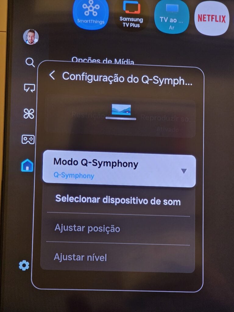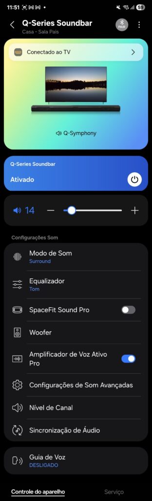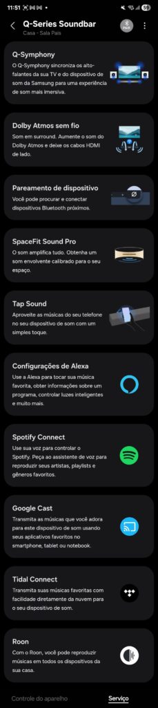Outro grande destaque é o Q-Symphony, que sincroniza os alto-falantes da soundbar com os da TV Samsung (compatível com modelos de 2022 a 2025). Na prática, isso resulta em maior imersão, diálogos cristalinos e melhor sensação de espacialidade sonora. E claro, é um plus adicional para quem vai adquirindo produtos para o ecossistema Samsung, uma hora essas adições vão se justificando.