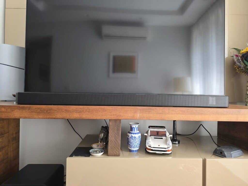 Se a sua TV tem 55 polegadas, como os modelos que usamos para testar a Q800F, o cumprimento da TV será um pouco maior do que a extensão da soundbar. Escrevo isso, pois meu toc não me deixaria ter uma soundbar mais cumprida do que a TV em cima do meu móvel.