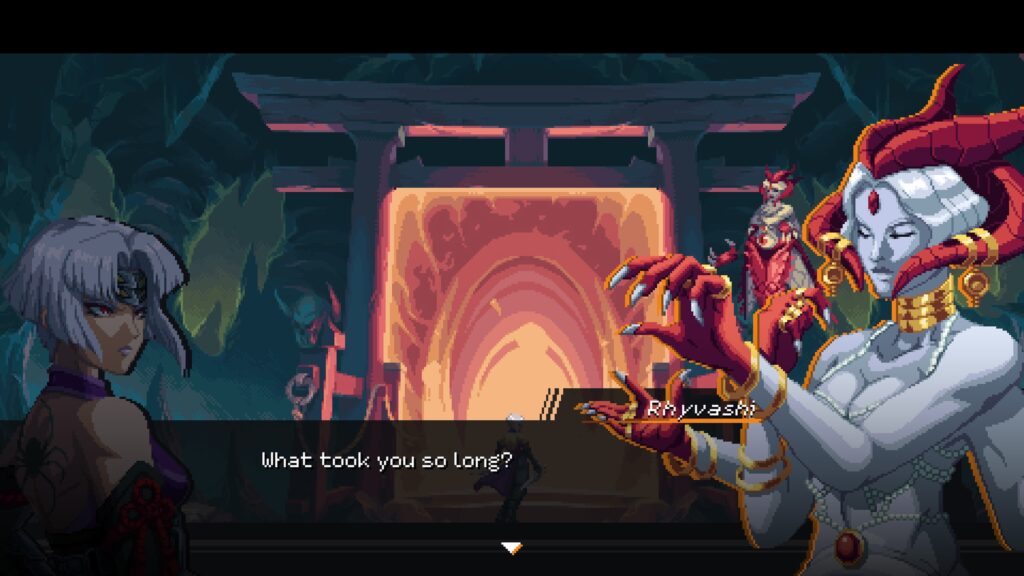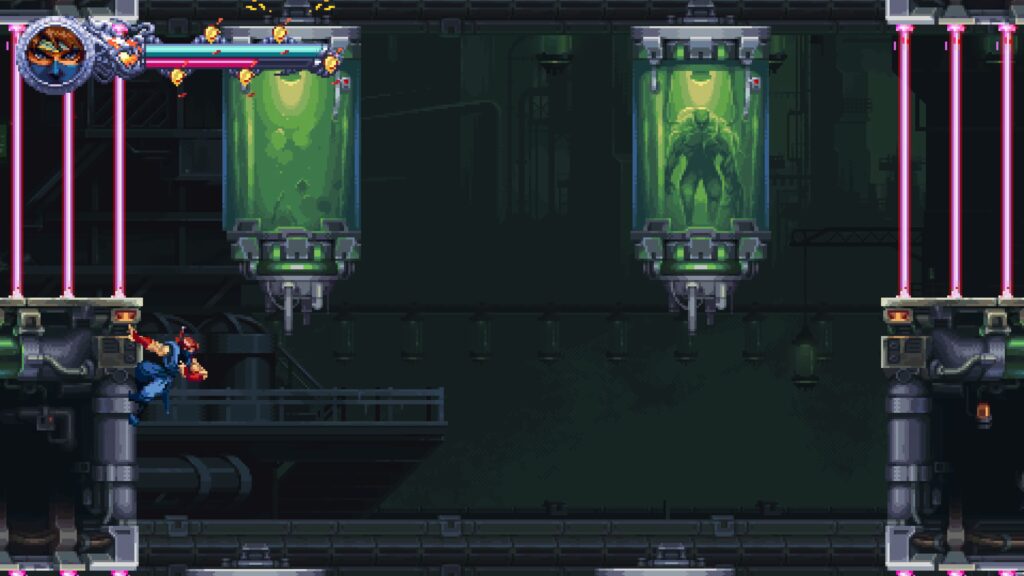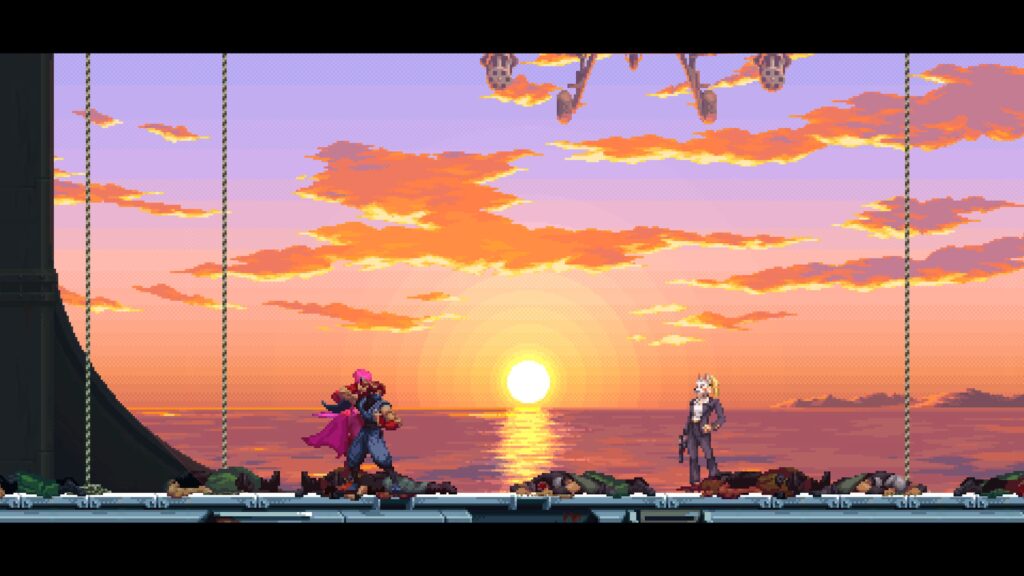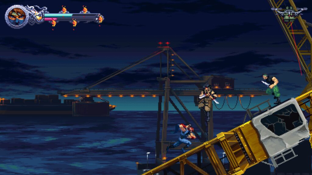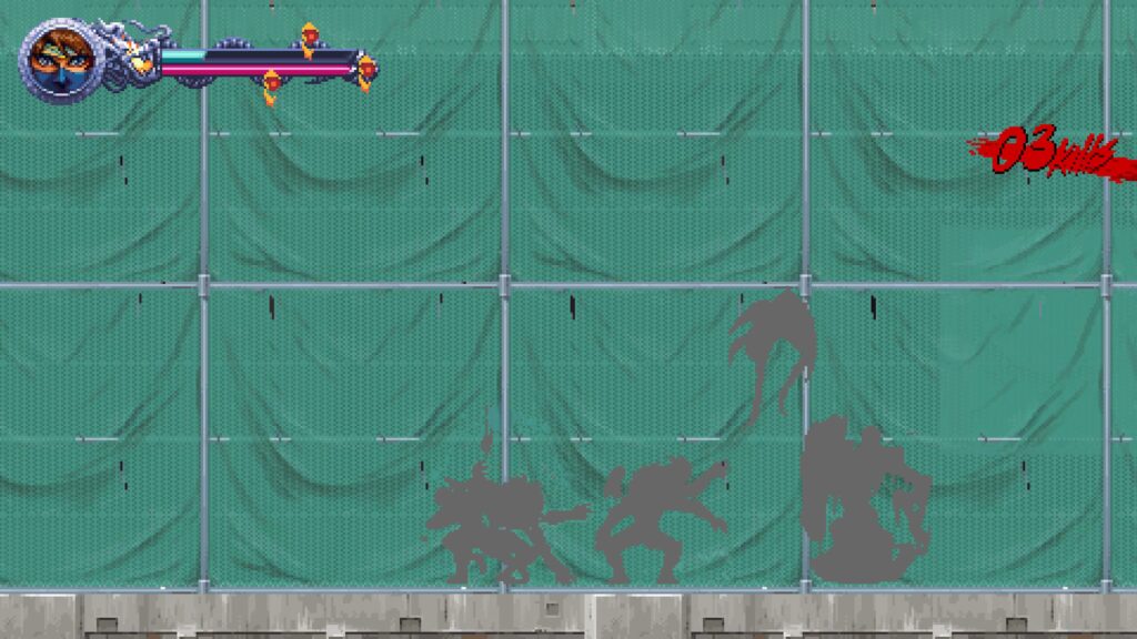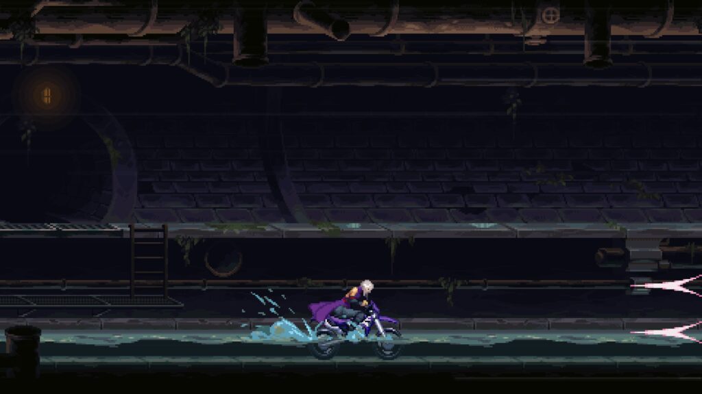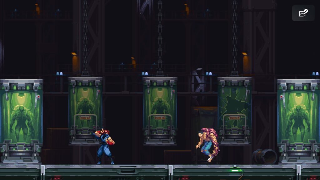 O design de fases de Ragebound é um show à parte. Cada nível é uma obra de arte, não apenas em termos visuais, com uma pixel art de tirar o fôlego que lembra o estilo de Blasphemous, mas também em sua estrutura e ritmo. As fases são longas e variadas, misturando momentos de puro combate com desafios de plataforma, fugas em alta velocidade e até seções em veículos. Não há tempo para o tédio aqui; o jogo está sempre apresentando algo novo, mantendo o jogador engajado do início ao fim.