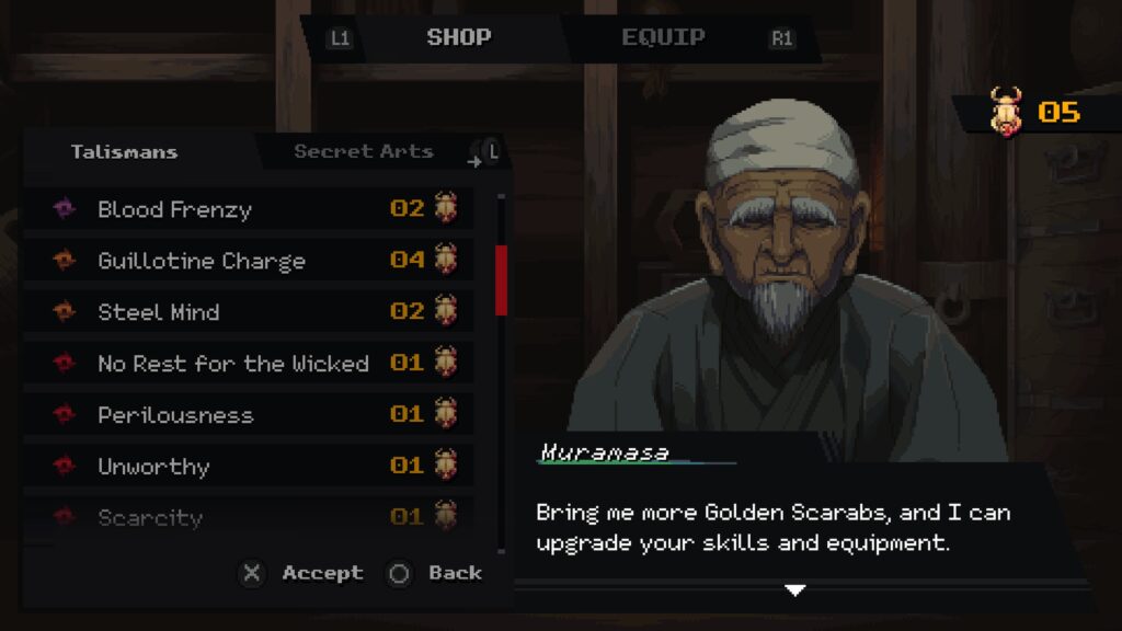 A jogabilidade é complementada por um sistema de customização que permite adaptar a experiência ao seu estilo de jogo. Kenji pode equipar talismãs que concedem bônus, como a recuperação total de vida em checkpoints, ou até mesmo penalidades que aumentam a dificuldade em troca de pontuações mais altas. Já Kumori tem acesso a diferentes tipos de armas e habilidades especiais, desbloqueadas ao encontrar colecionáveis escondidos nas fases. Essa personalização, embora não seja complexa, oferece um toque extra de estratégia e rejogabilidade.