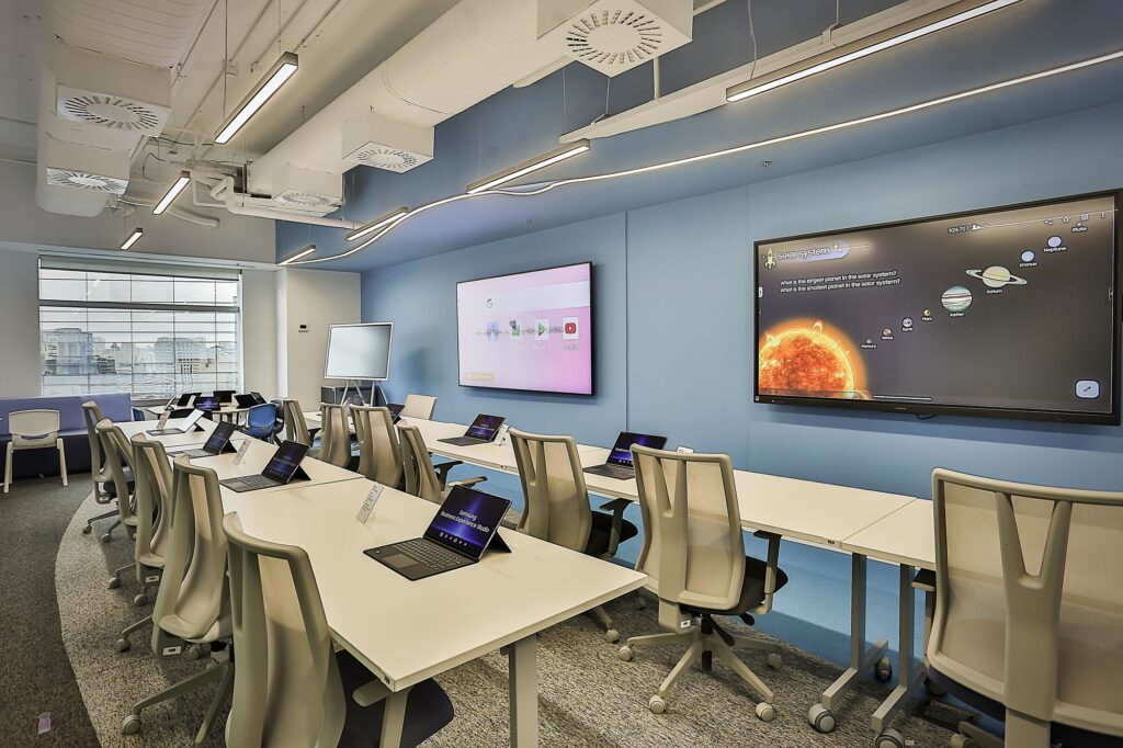 O showroom conta com 10 ambientes temáticos que representam verticais estratégicas da companhia, incluindo monitores profissionais, dispositivos móveis, displays interativos e ferramentas de segurança. A conectividade entre dispositivos é uma das características do espaço, com demonstrações do ecossistema Galaxy e da plataforma Samsung Knox Suite.
