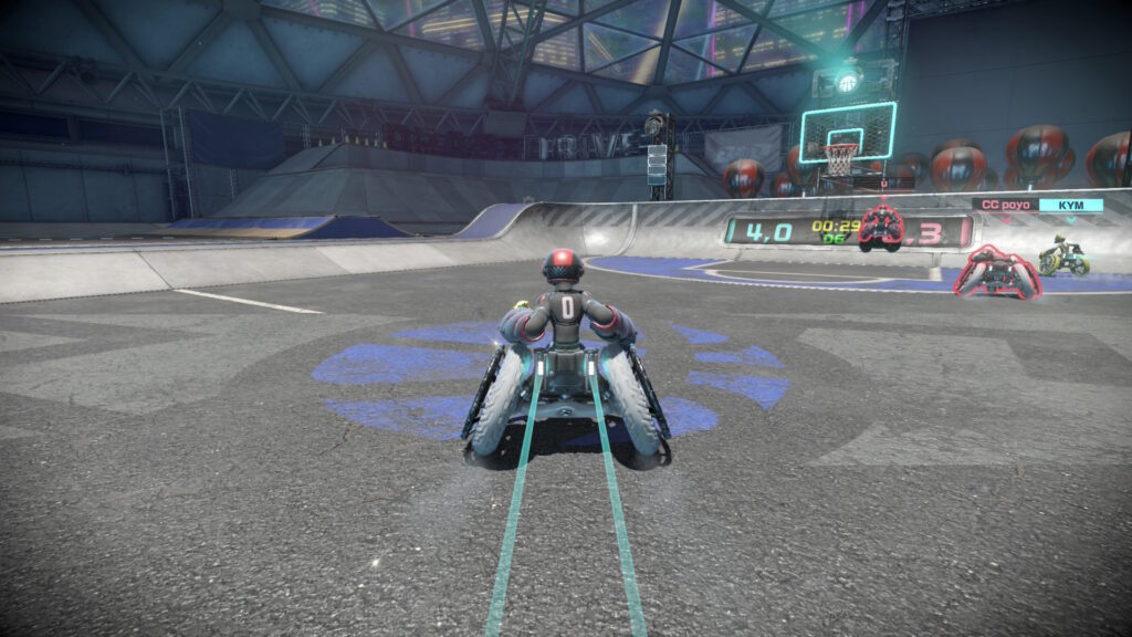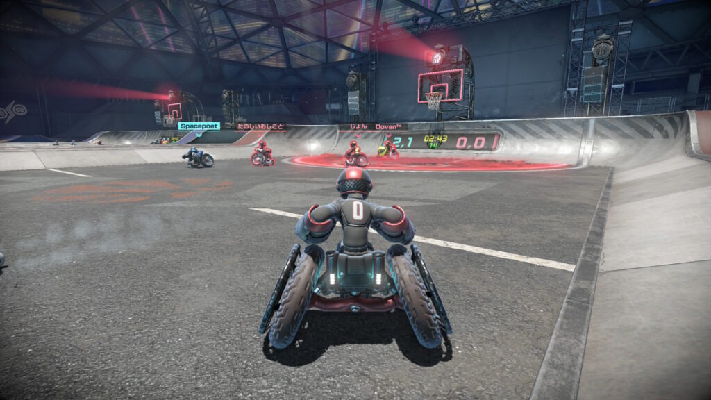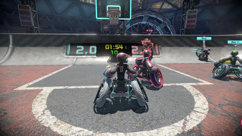 Os jogos são rápidos, e cada ponto é crucial. As cestas valem dois pontos, mas manobras bem-sucedidas podem adicionar 0,1 ou 0,2 pontos ao placar, um detalhe que frequentemente define o resultado. Arremessos de longa distância, por sua vez, valem três pontos. A cada duas partidas, a ação é interrompida para um de dois minigames: uma corrida ou um desafio para ver quem pega primeiro uma bola disparada no centro da arena. Ambos são breves e servem como uma boa quebra de ritmo.