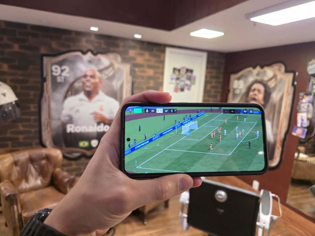 O clima estava animado, com muita gente jogando EA Sports FC Mobile no celular, conversando sobre futebol e curtindo a decoração. A barbearia se tornou praticamente um museu interativo do esporte, mas com a cara e o estilo do game.