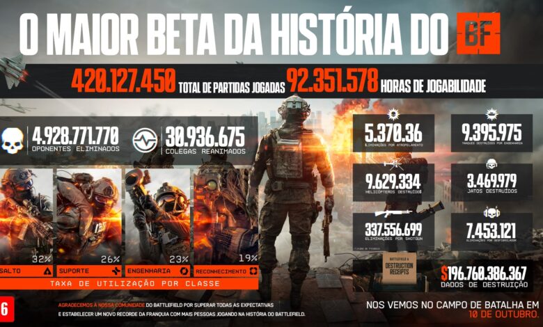 As estatísticas do beta incluem o total de partidas jogadas, horas de gameplay, helicópteros destruídos, mortes por desfibrilador e a porcentagem de classes selecionadas. As equipes do Battlefield Studios expressaram gratidão pelo feedback dos jogadores e irão compartilhar mais informações sobre Battlefield 6 conforme se aproxima seu lançamento, agendado para 10 de outubro. O jogo estará disponível para PlayStation 5, Xbox Series X|S e PC.