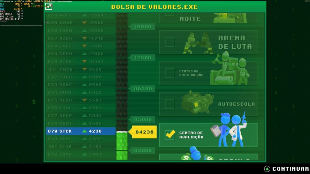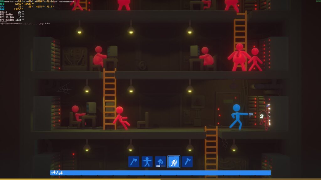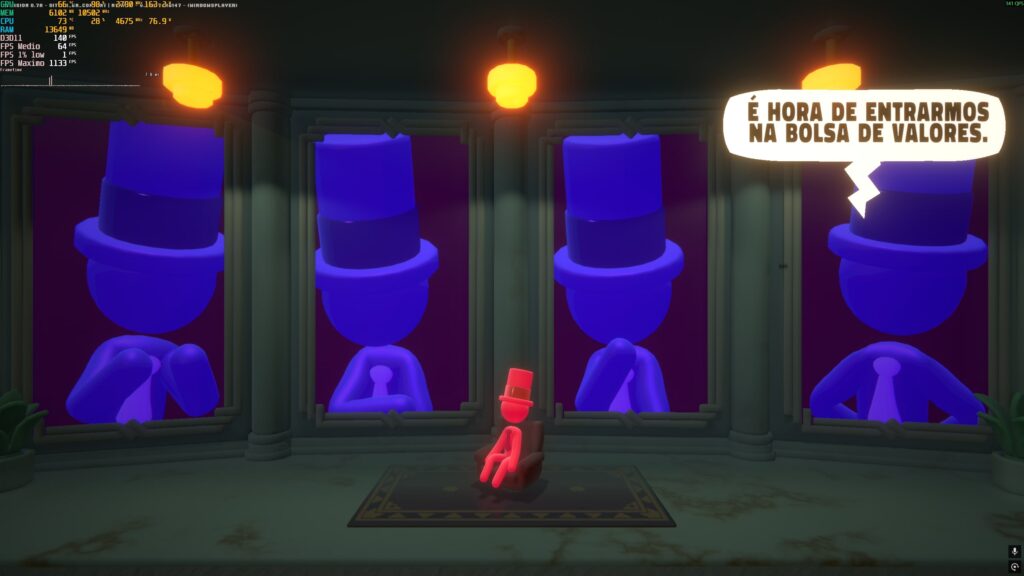 Rodando em um PC equipado com uma RTX 4070 Super e um Ryzen 7 5800X, o jogo inicialmente apresentou resultados sólidos, chegando a mais de 100 fps em resolução 2K. Com o passar das partidas, porém, a performance começou a cair de forma perceptível. Além disso, um detalhe curioso chamou a atenção: ao concluir andares, o jogo insere um slowdown proposital para marcar a transição de fase, mas em alguns momentos esse efeito parecia se estender além do planejado, resultando em quedas bruscas de fluidez, quase como se fosse uma apresentação de slides.