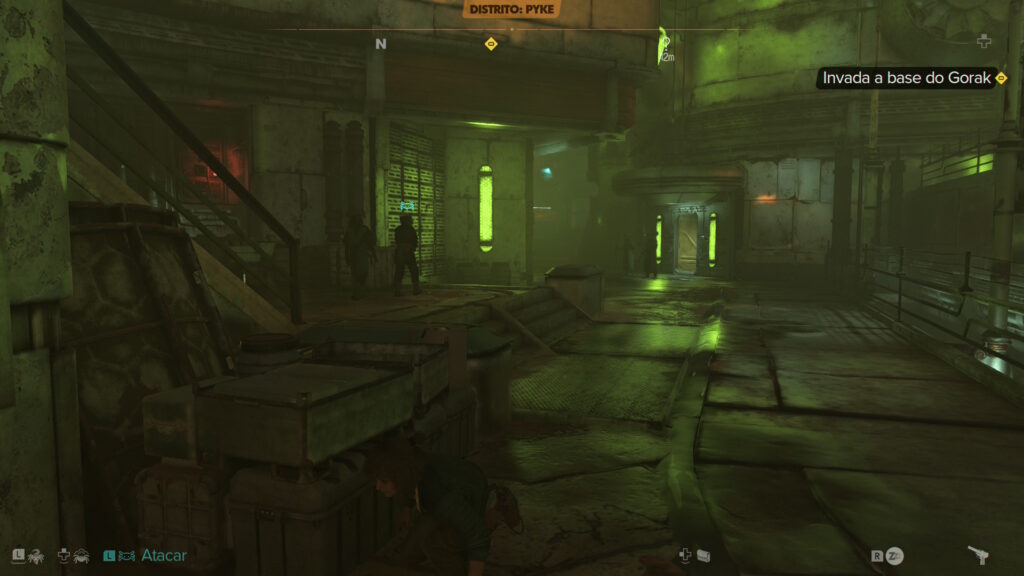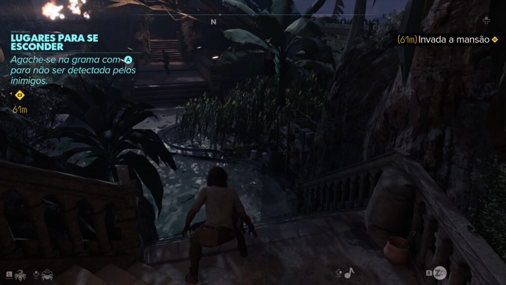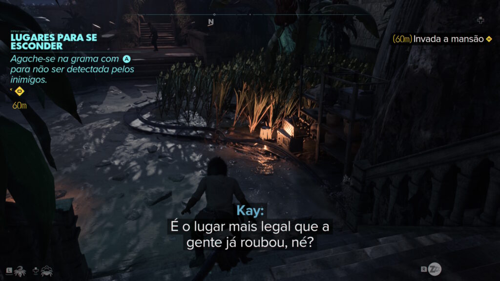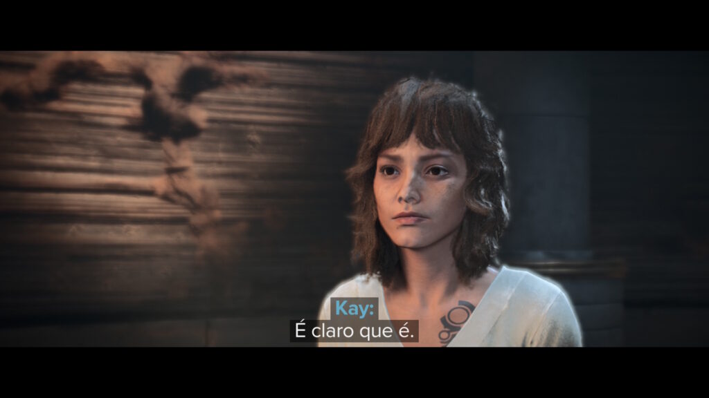Entre os principais pontos, o mais notável é o impacto da reconstrução via técnicas como DLSS, que resulta em alguns artefatos visuais. O cabelo da protagonista Kay Vess, por exemplo, apresenta um efeito de serrilhado em cenas contra a luz, algo perceptível também na vegetação. Em comparação com as versões de PC e consoles mais poderosos, nota-se que houve simplificação na física da vegetação e iluminação, o que reduz parte da imersão visual. Em alguns momentos específicos, notei algumas cenas mais escuras do que deveriam, dificultando visualizar certos pontos.
