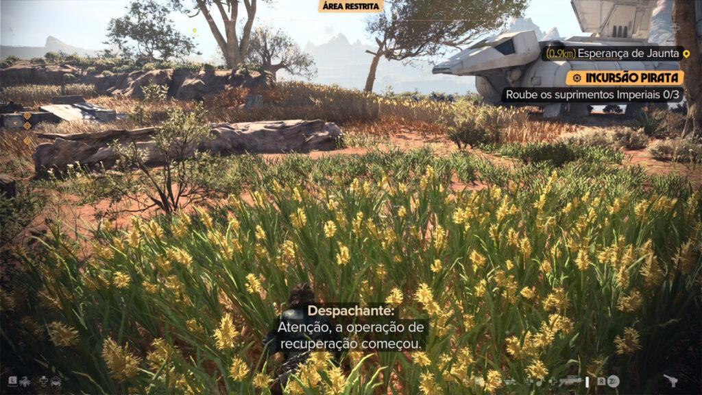 Logo ao iniciar Star Wars Outlaws no Nintendo Switch 2, a primeira impressão é extremamente positiva: o jogo é surpreendentemente fluido. Assim como aconteceu com Hogwarts Legacy no lançamento do console, temos aqui um 30 FPS estável e consistente, sem quedas perceptíveis, mesmo em áreas de mundo aberto — justamente onde a expectativa era de que o hardware pudesse sofrer.