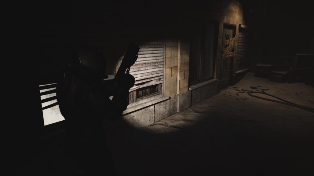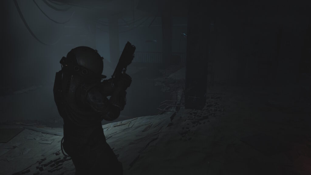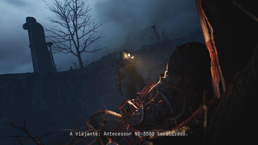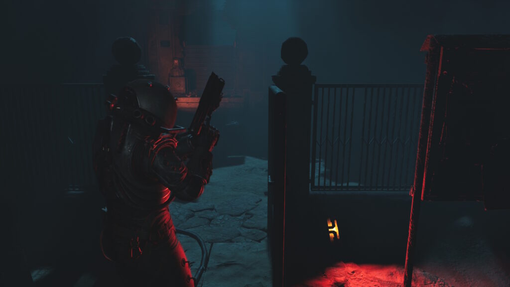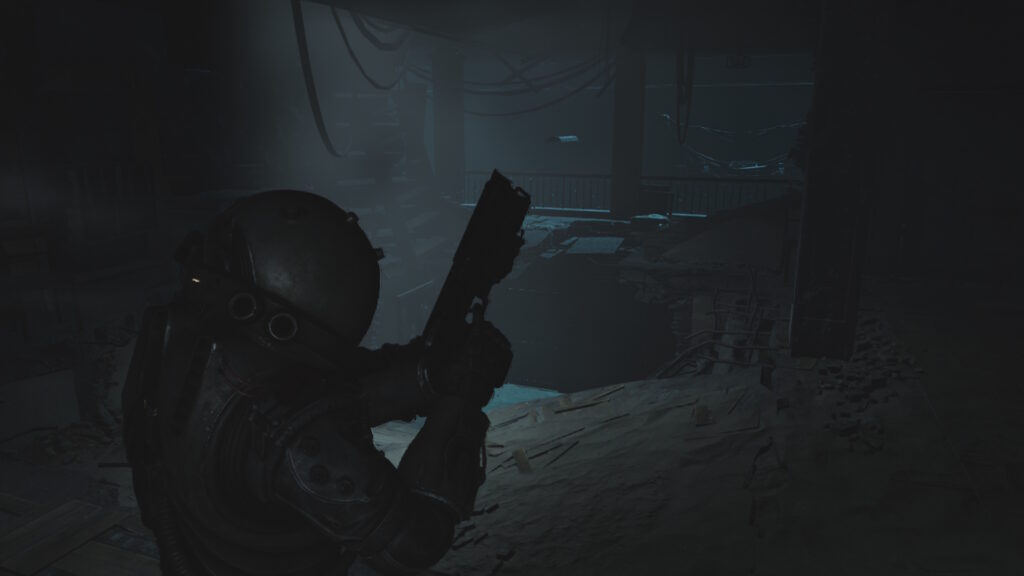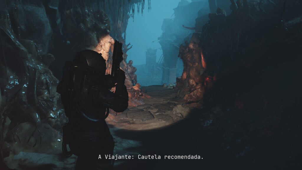 O maior problema está na iluminação. Assim como em Star Wars Outlaws, aqui há suporte a técnicas de Ray Tracing adaptadas, mas em Cronos The New Dawn isso é feito via Nanite da Unreal Engine 5, processado por software. O resultado é inconsistente: glitches de iluminação são frequentes, com áreas que deveriam estar iluminadas escurecendo ao mover a câmera ou ao andar pelo cenário. Essa limitação é perceptível e pode incomodar bastante, já que o jogo aposta em uma ambientação escura e dependente da luz para criar tensão.