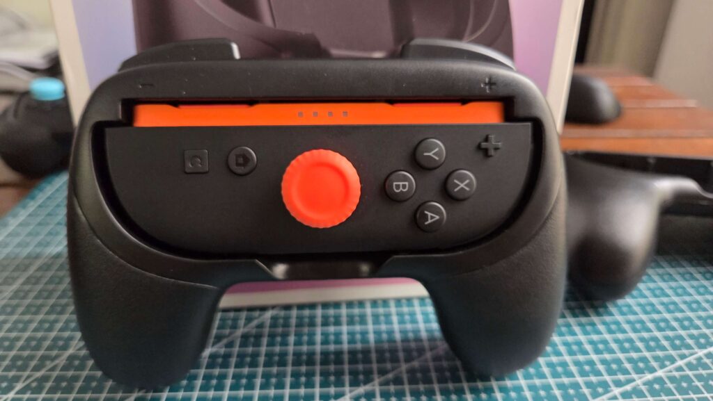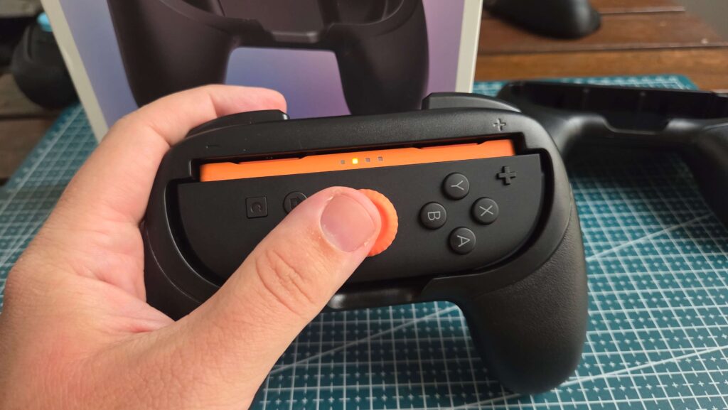 O acessório amplia a área de pegada e distribui melhor o peso, reduzindo a sensação de desconforto em sessões mais longas. Ele não transforma o Joy-Con em um controle tradicional, mas dá um salto considerável em termos de usabilidade. É o tipo de acessório que parece opcional à primeira vista, mas que acaba sendo bastante útil no uso contínuo.