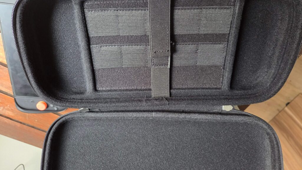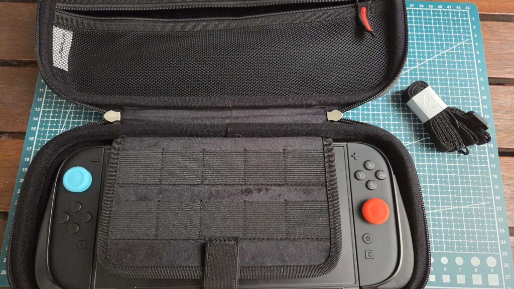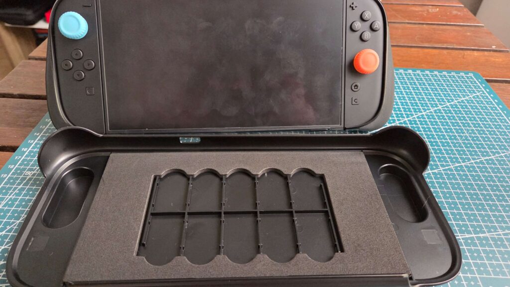 A sua capa superior protege bem o Switch 2 assim como possui espaço para 10 cartuchos. Ou seja, ela lembra muito a case compacta que já avaliamos, só que ela traz a ergonomia que é um diferencial para quem busca isso.