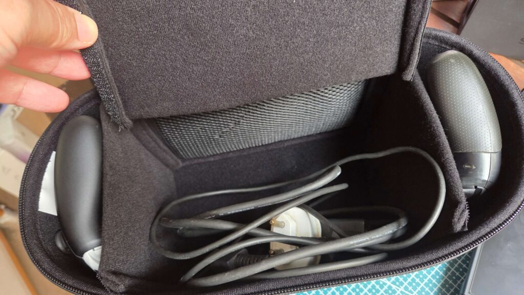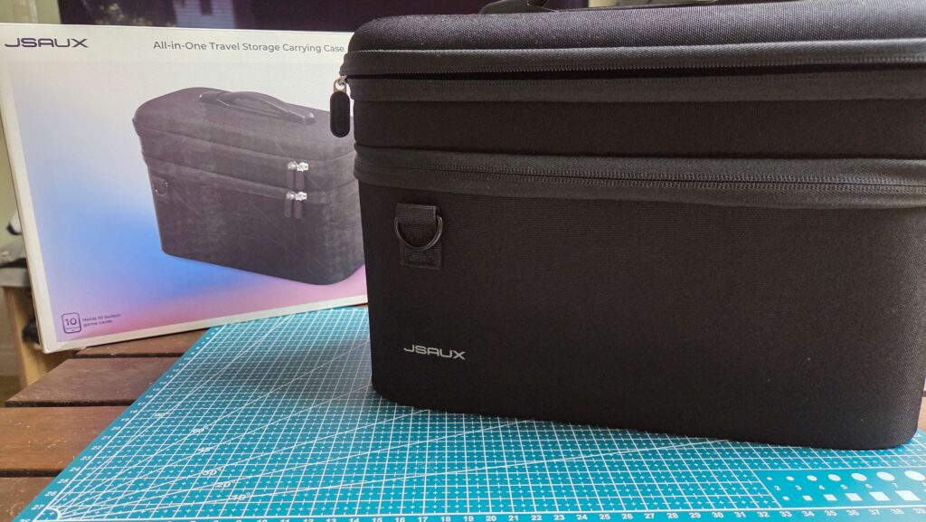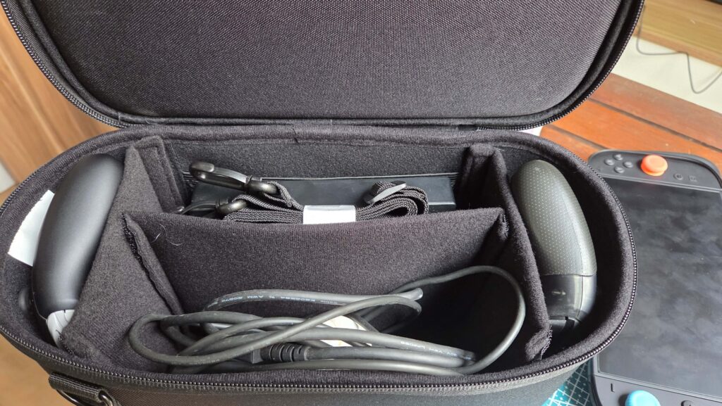 A All-in-One Carrying Case é uma case robusta, pensada para quem deseja transportar não apenas o console, mas também o dock oficial e alguns acessórios extras, incluindo controles. O interior é bem estruturado, com divisórias que ajudam a manter tudo organizado, evitando riscos de choque entre as peças.
