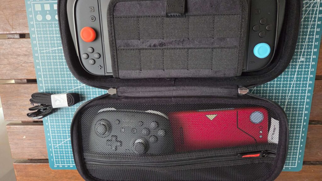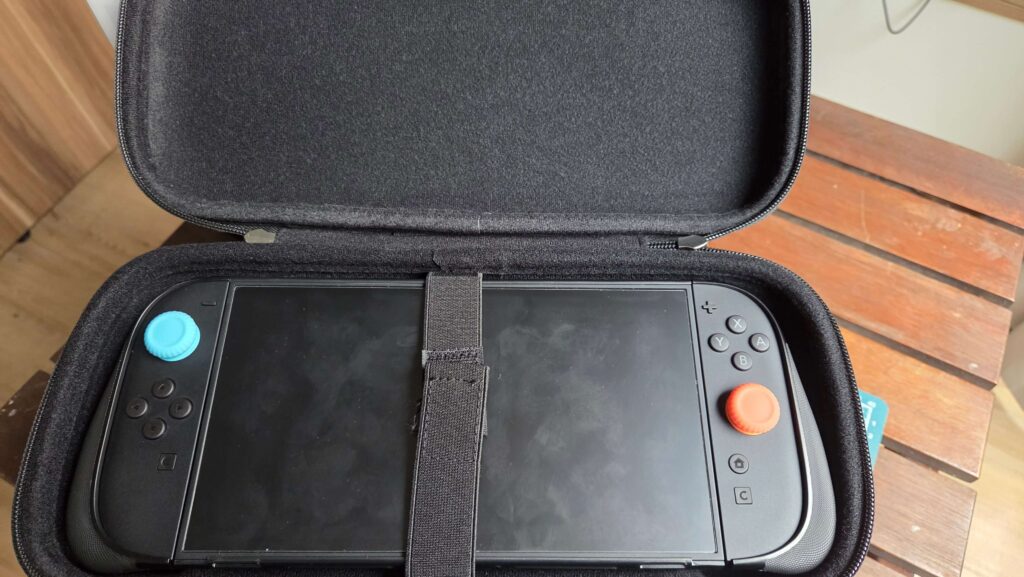 O design interno permite guardar o Switch 2, cabos, jogos e até alguns acessórios extras, mantendo tudo bem protegido. Ainda assim, ela consegue ser relativamente fácil de transportar, cabendo em mochilas maiores ou até sendo carregada sozinha sem muito incômodo.
