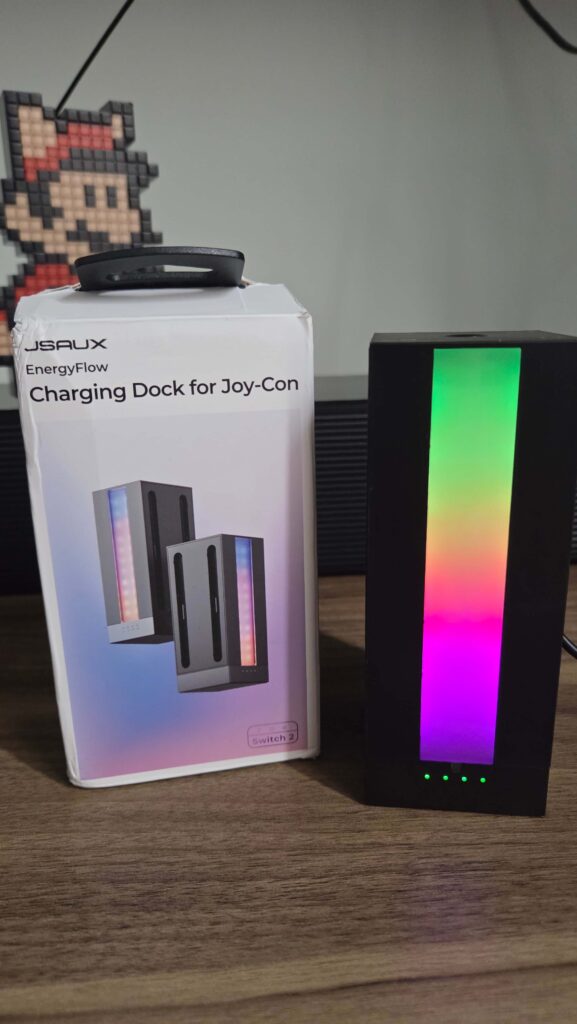 O EnergyFlow é um dock de carregamento dedicado aos Joy-Con 2, algo que facilita bastante para quem tem mais de um par. Em vez de depender unicamente da recarga feita no próprio console, é possível deixar os controles sempre prontos em um suporte fixo.