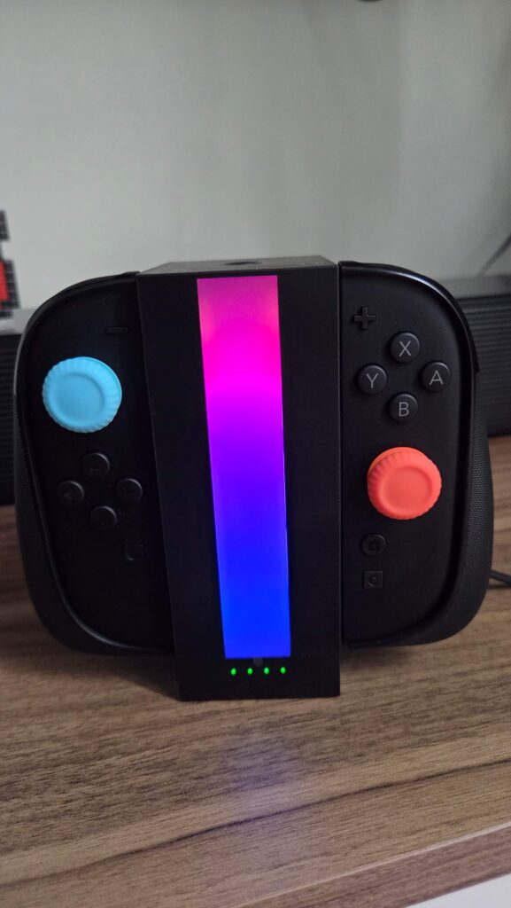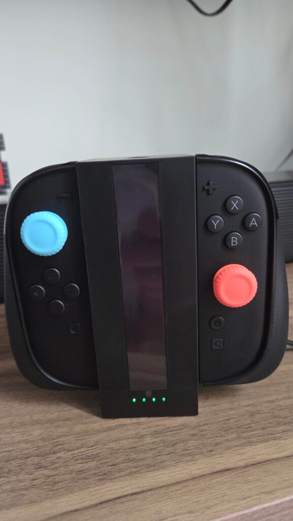 O acessório também ajuda na organização: os Joy-Con ficam encaixados de forma prática, evitando que fiquem soltos em gavetas ou espalhados. Durante o teste, o carregamento foi consistente, sem diferenças em relação ao console. É um produto simples, mas que atende uma necessidade real — especialmente para famílias ou grupos que usam vários controles.